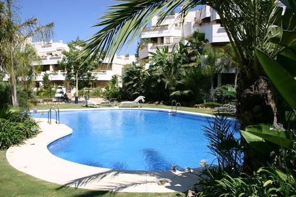 The complex has beautiful tropical gardens with a large central swimming pool a heated indoor pool with dressing rooms sauna Turkish bath fully equipped gym and 24h security .