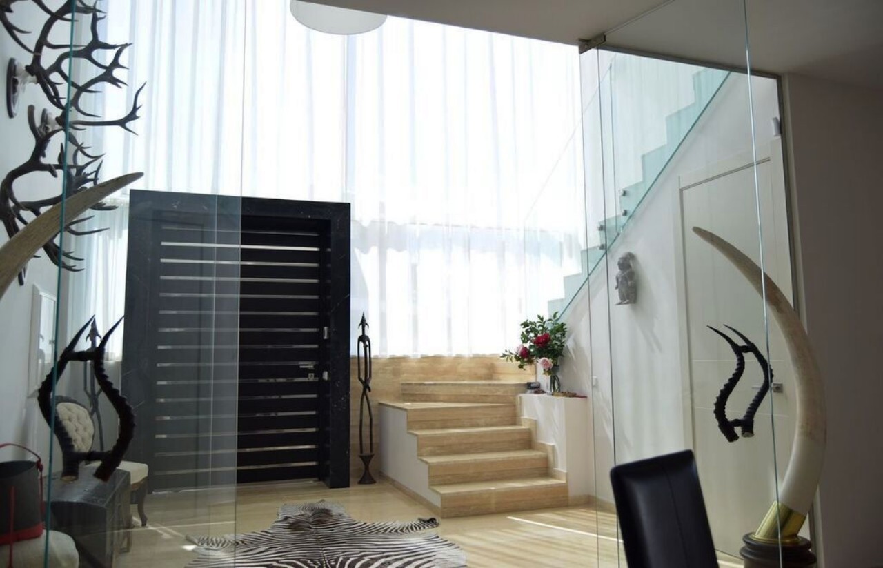 This detached luxury residence benefits from a large plot of 1.024 m2 with private pool spacious terraces open plan interiors with glass windows from floor to ceilings fully fitted kitchen with high end appliances air conditioning beautiful marble floors underfloor heating throughout fully fitted bathrooms and beautiful Mediterranean gardens .
