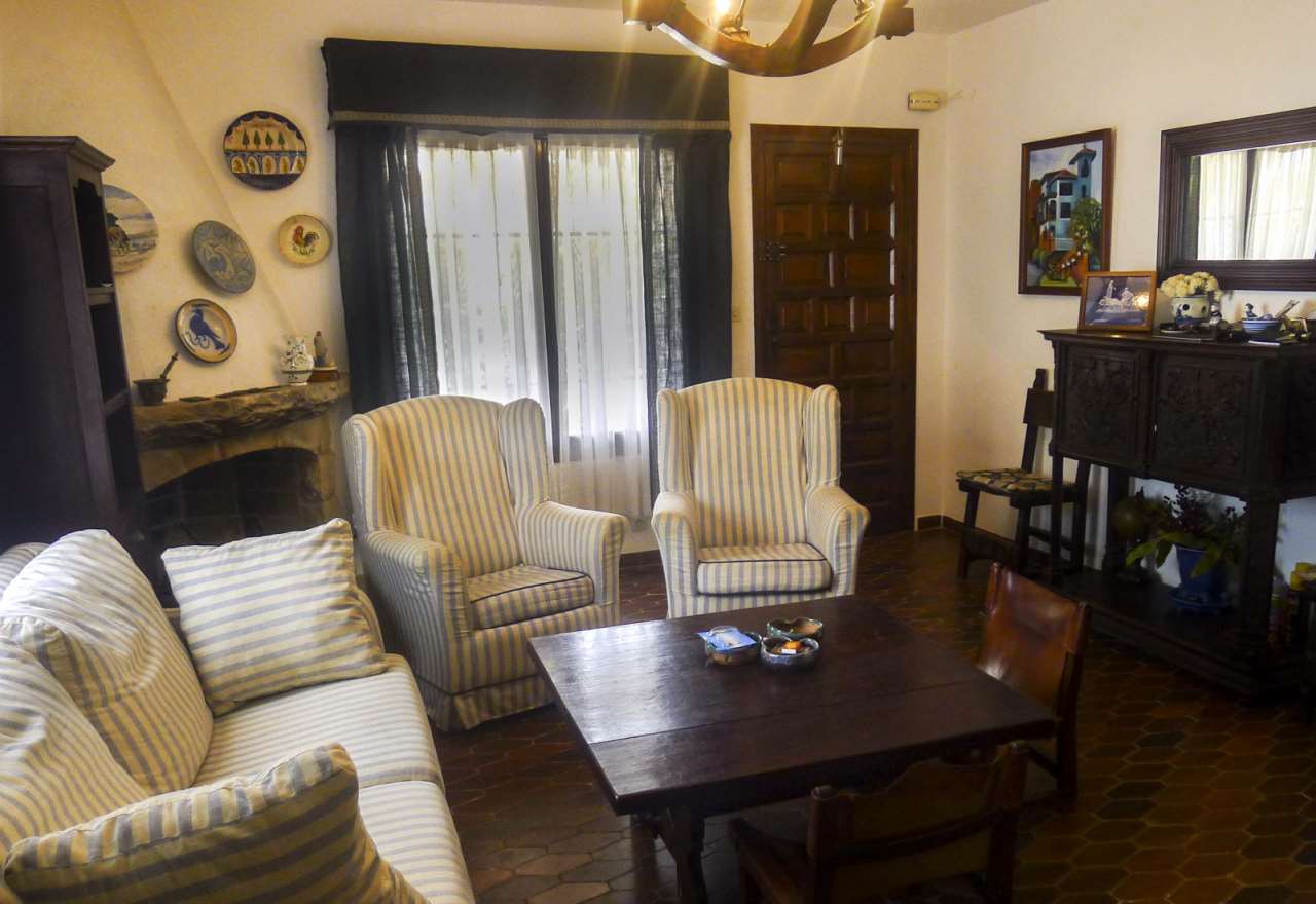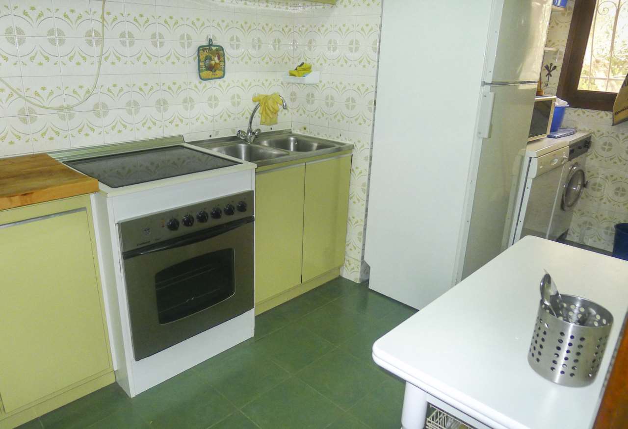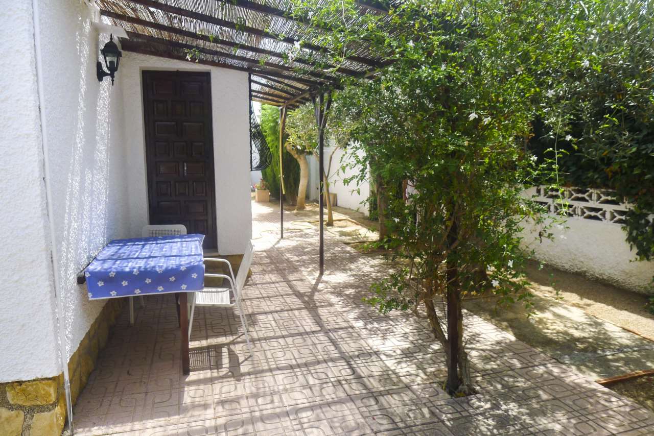 Independent villa for sale in Albir. It comprises of a living room kitchen three bedrooms and two bathrooms one with bathtub. It has a plot of 619 m2 with a lovely garden covered terrace and parking area.