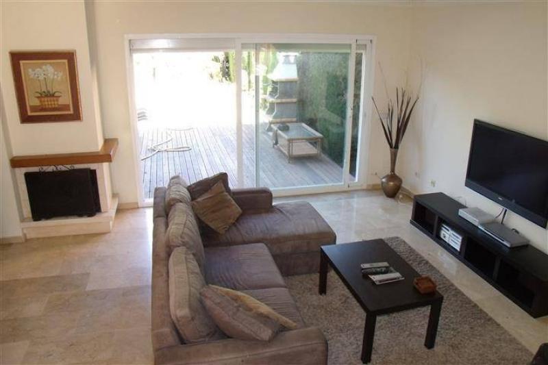 Walking distance to the Beach and Puerto Banus, close to Golf, Schools and Colleges and offering excellent rental potential. This large townhouse with a good size garden is very good value. Good size living areas with working fireplace and Air Conditioning Hot/Cold, Saterlite TV, fully fitted kitchen, private integral garage, roof terrace. The development is gated and has 2 superb swimming pools.