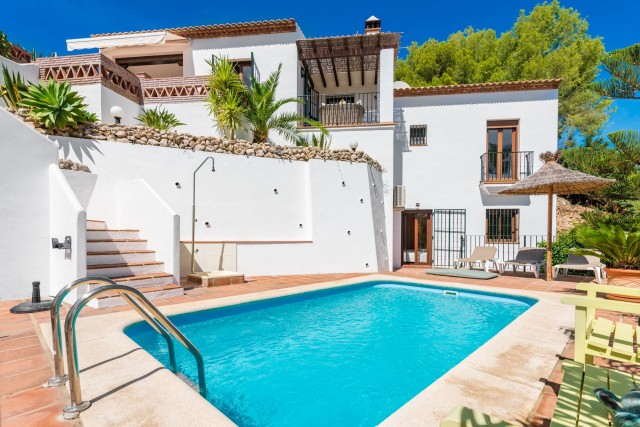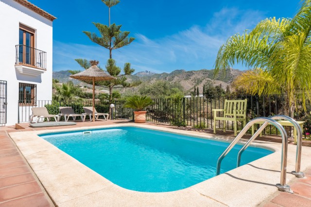Modern detached villa built to a high standard in a quiet location just outside of Nerja Three bedrooms two bathrooms large garage/utility spacious lounge diner and quality kitchen. Various patios and terraces easily maintained gardens and delightful pool area.