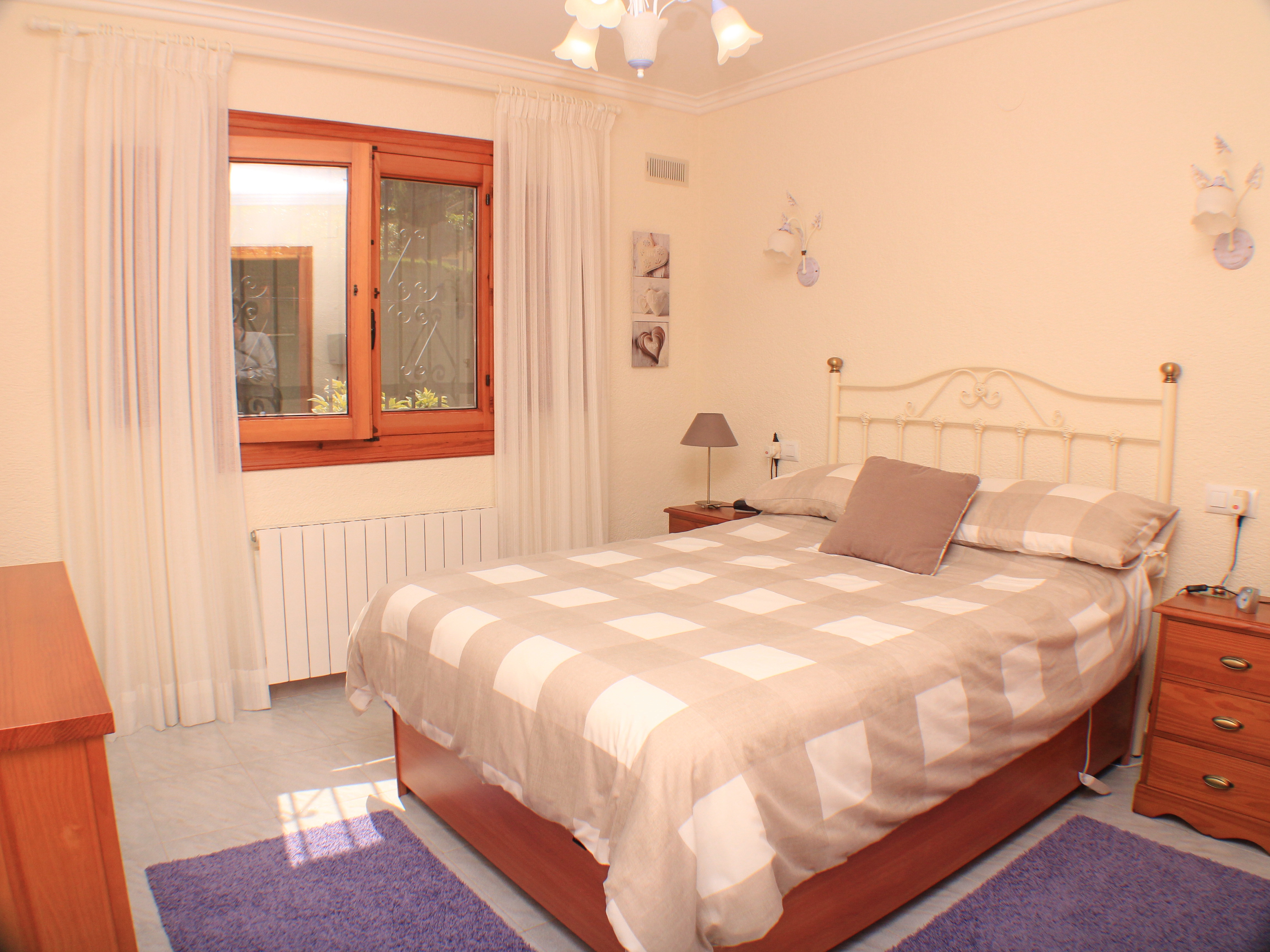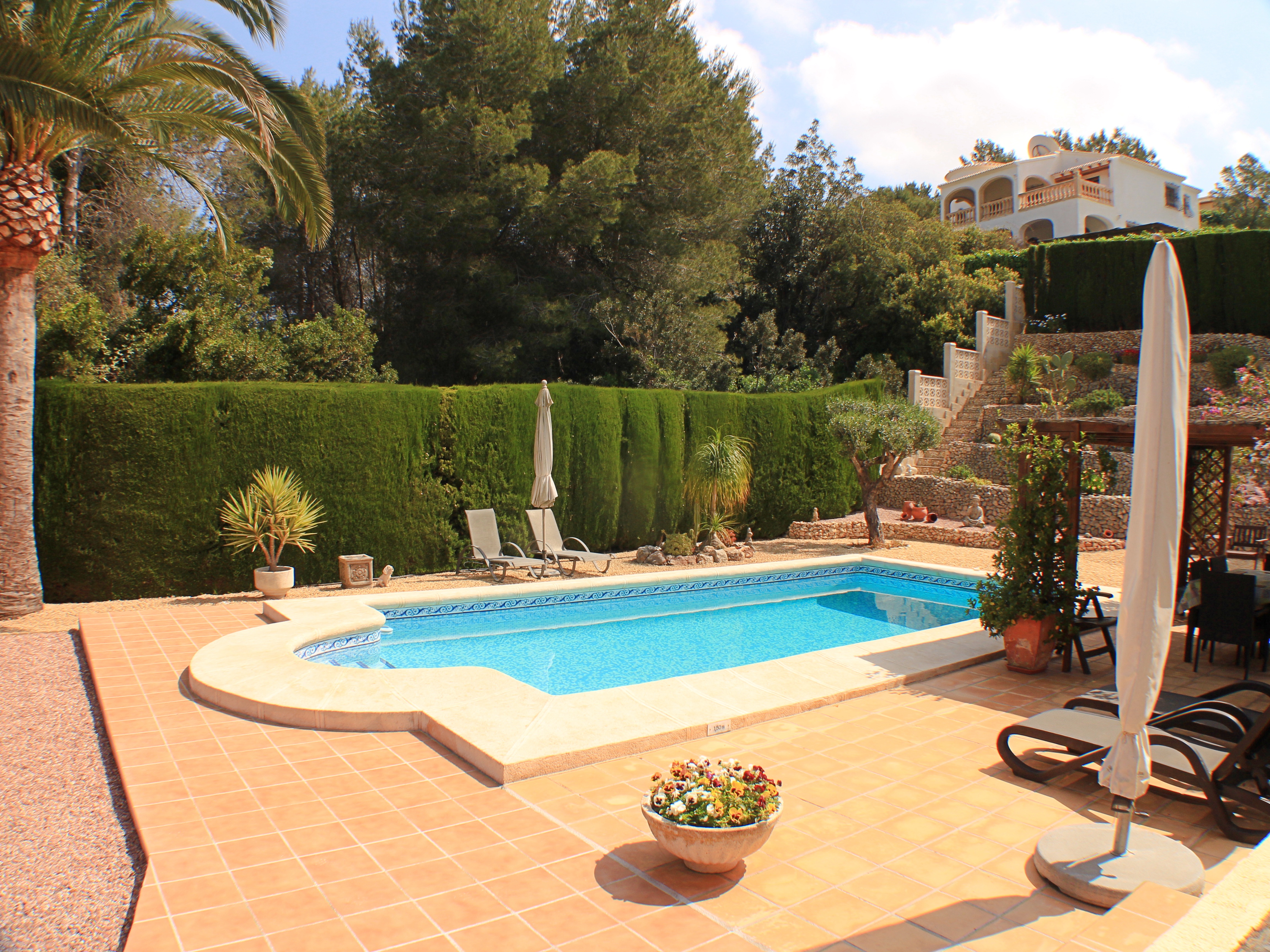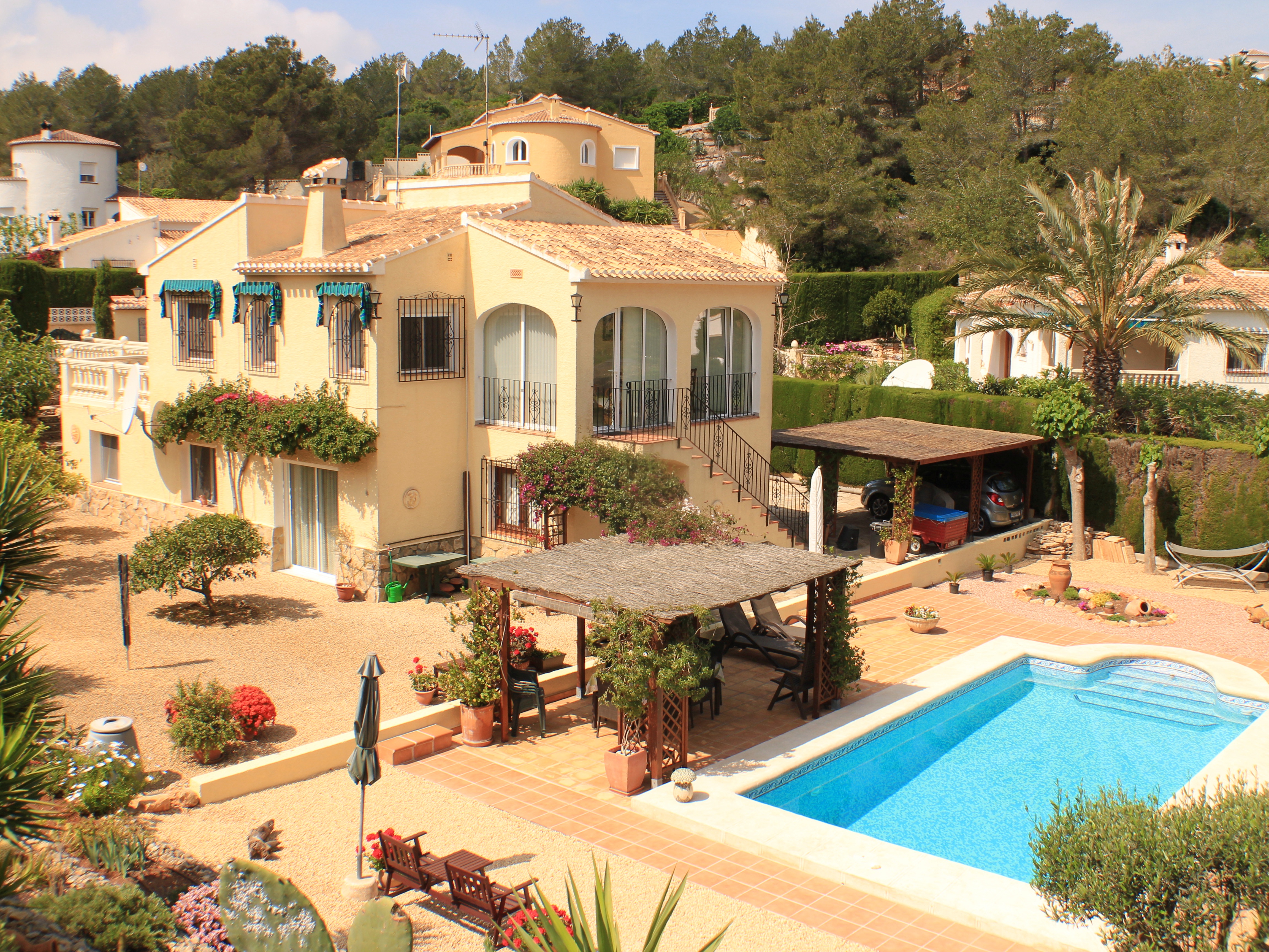 This very well presented villa is situated on a very nice corner plot in the established Covatelles area of Javea it is surrounded by beautifully landscaped private gardens with all day sun. From street level the main entrance leads past a sunny terrace to the door of the main living area. Inside a hallway leads to the living room with fireplace and and a separate kitchen From the living area you can access the glazed covered terrace (naya) which gives lovely views over the swimming pool and towards Montgo. Also on this level are two double bedrooms with fitted wardrobes and a family bathroom. Downstairs accessed by a separate entrance you will find an equally well presented guest apartment with kitchen living room with patio doors to the outside also there are two spacious double bedrooms with fitted wardrobes and a spacious family bathroom. Outside the fantastic swimming pool has surrounding terraces a pergola for shade a garage store room and a 2 car carport at the end of the paved drive. Th beautifully landscaped sloping plot is a pleasing mix of gravel and various trees suited to the excellent climate we get in Javea. This property deserves viewing soonest.