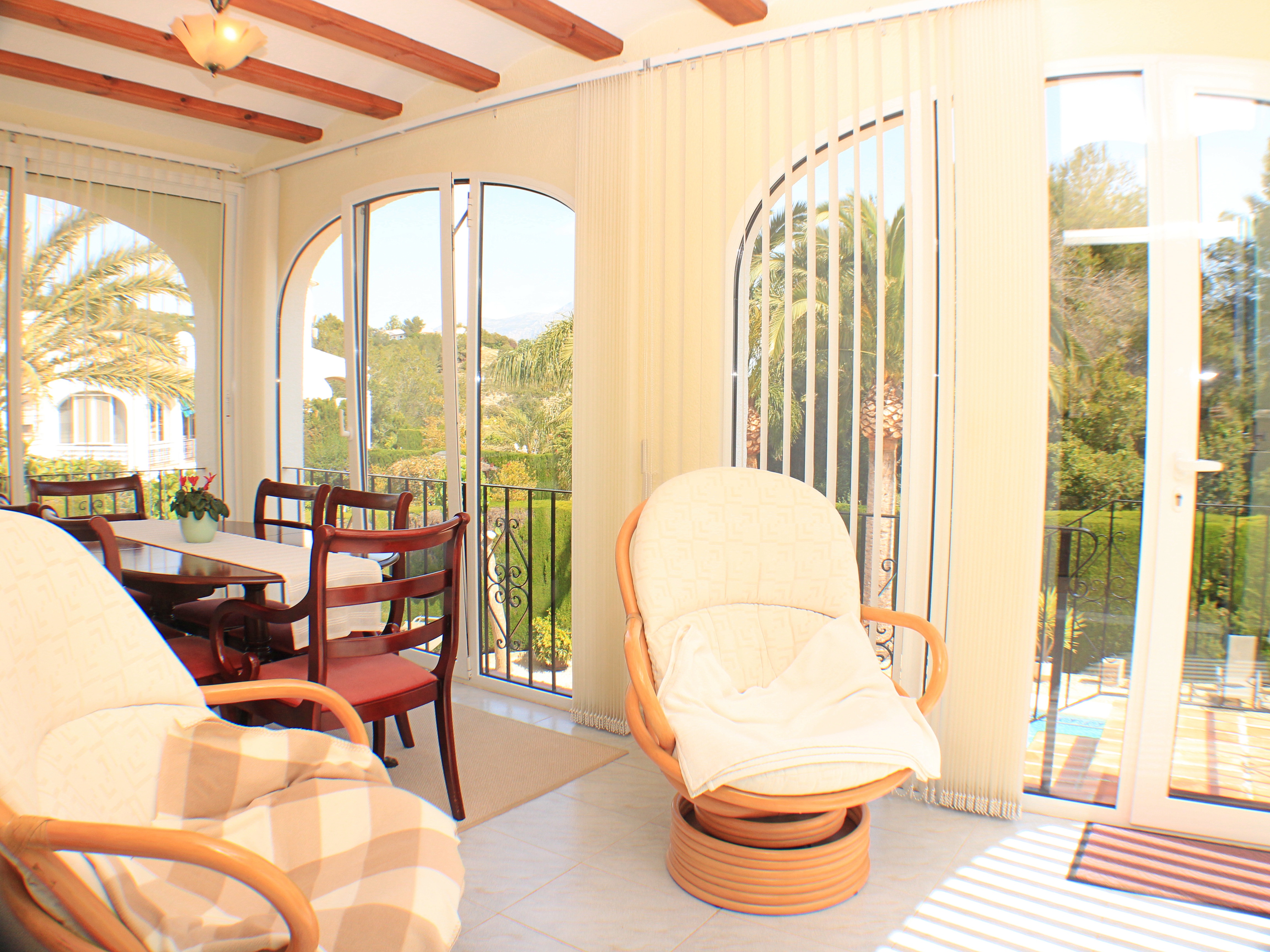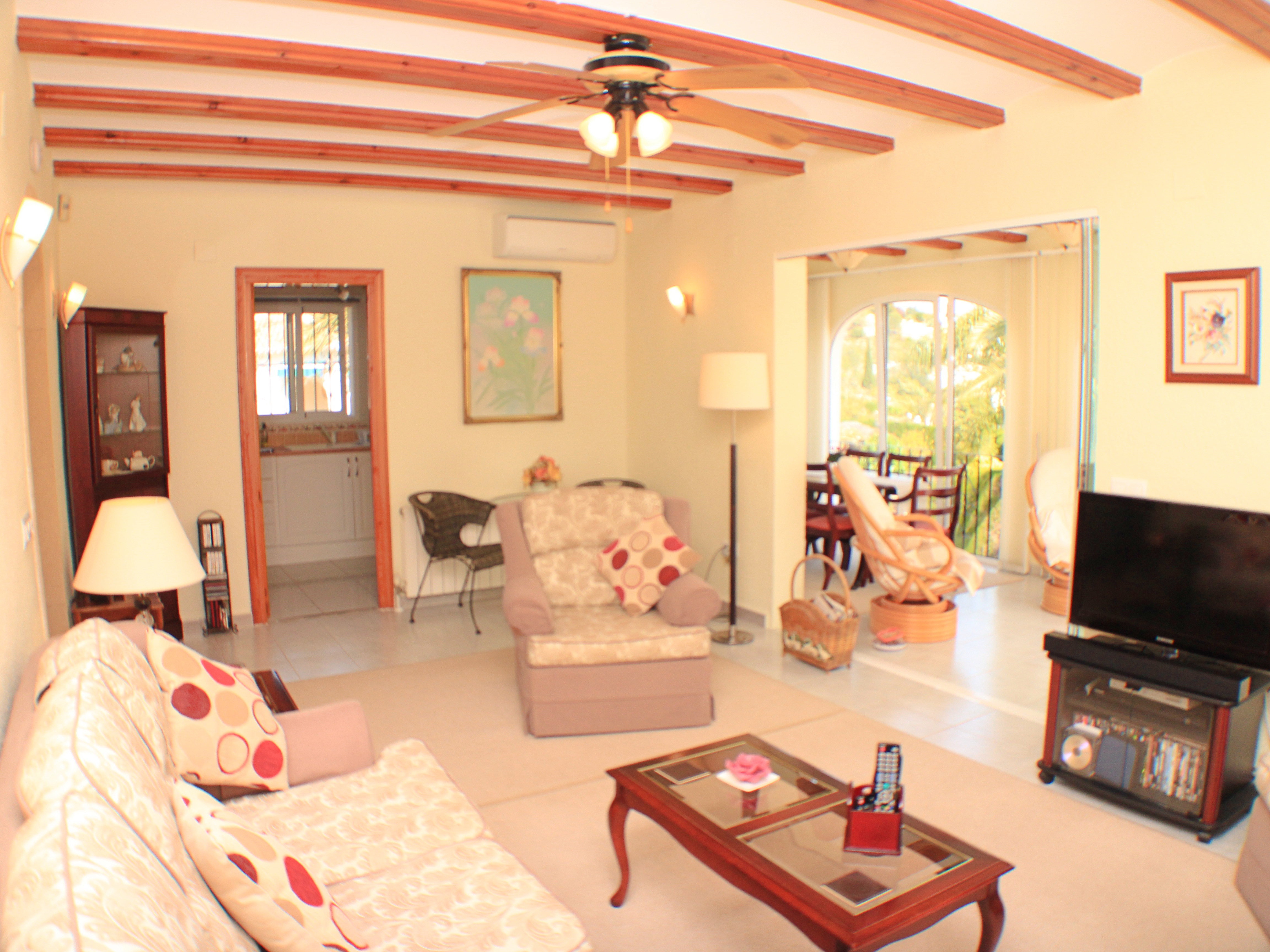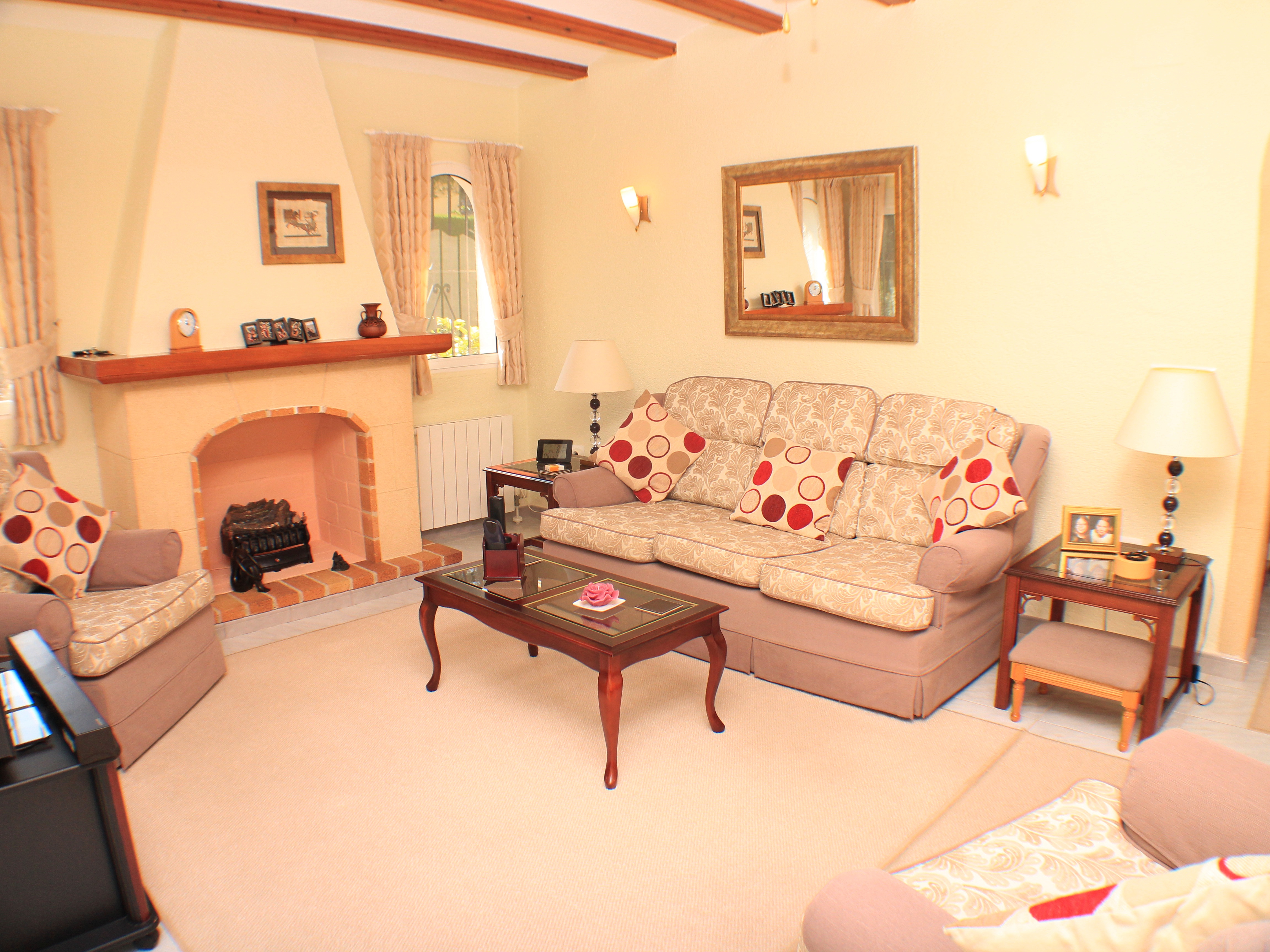 This very well presented villa is situated on a very nice corner plot in the established Covatelles area of Javea it is surrounded by beautifully landscaped private gardens with all day sun. From street level the main entrance leads past a sunny terrace to the door of the main living area. Inside a hallway leads to the living room with fireplace a...