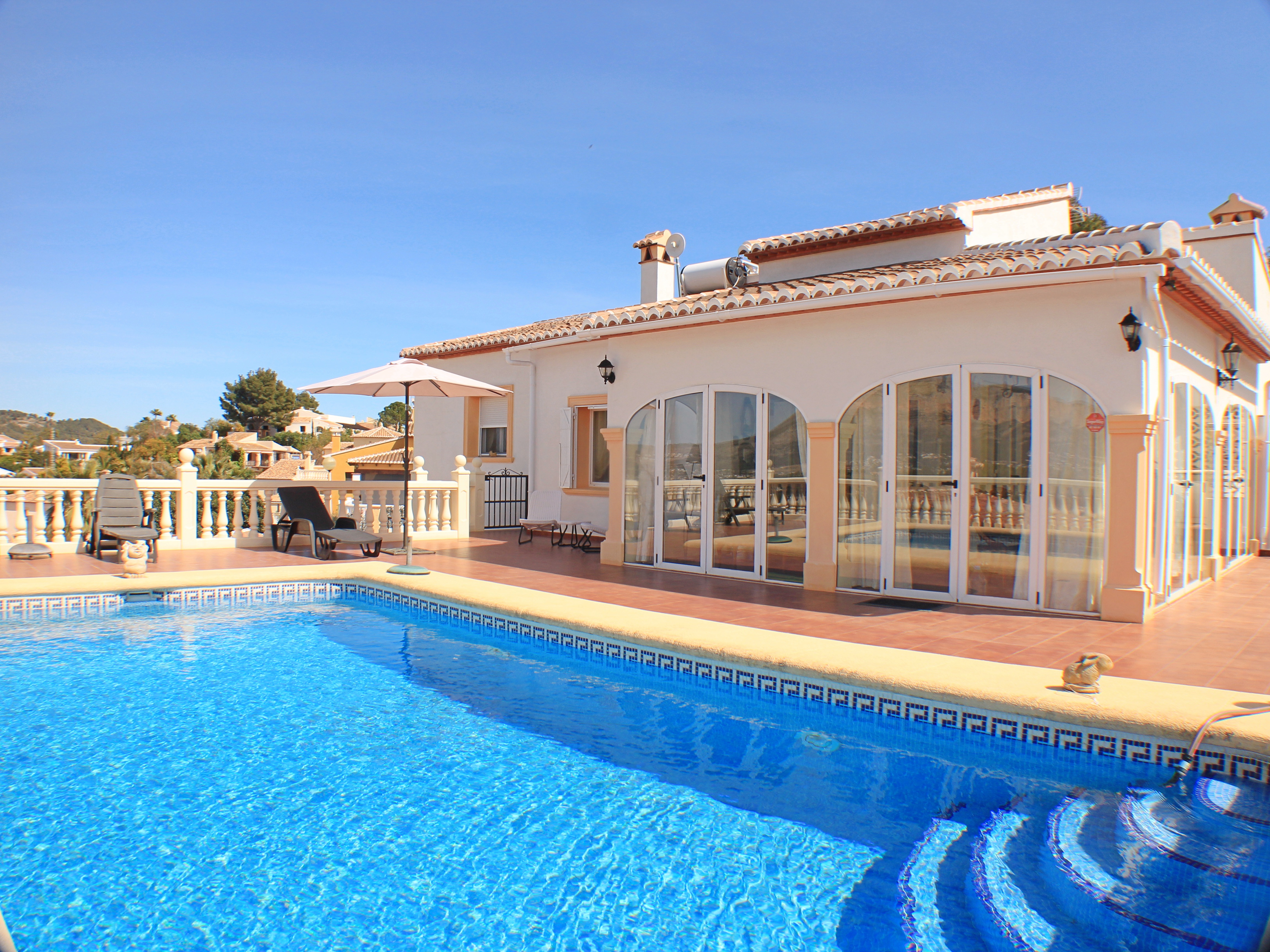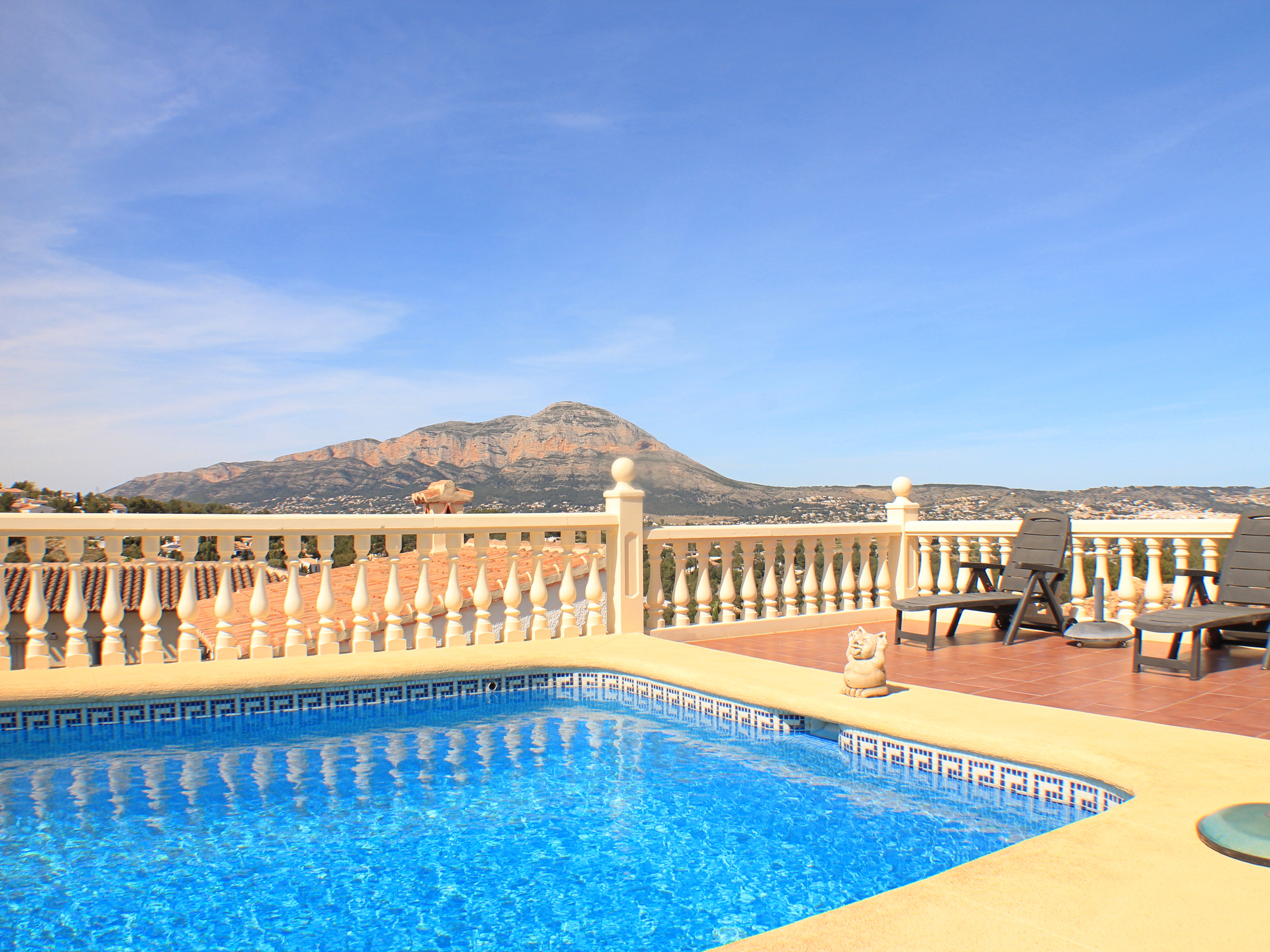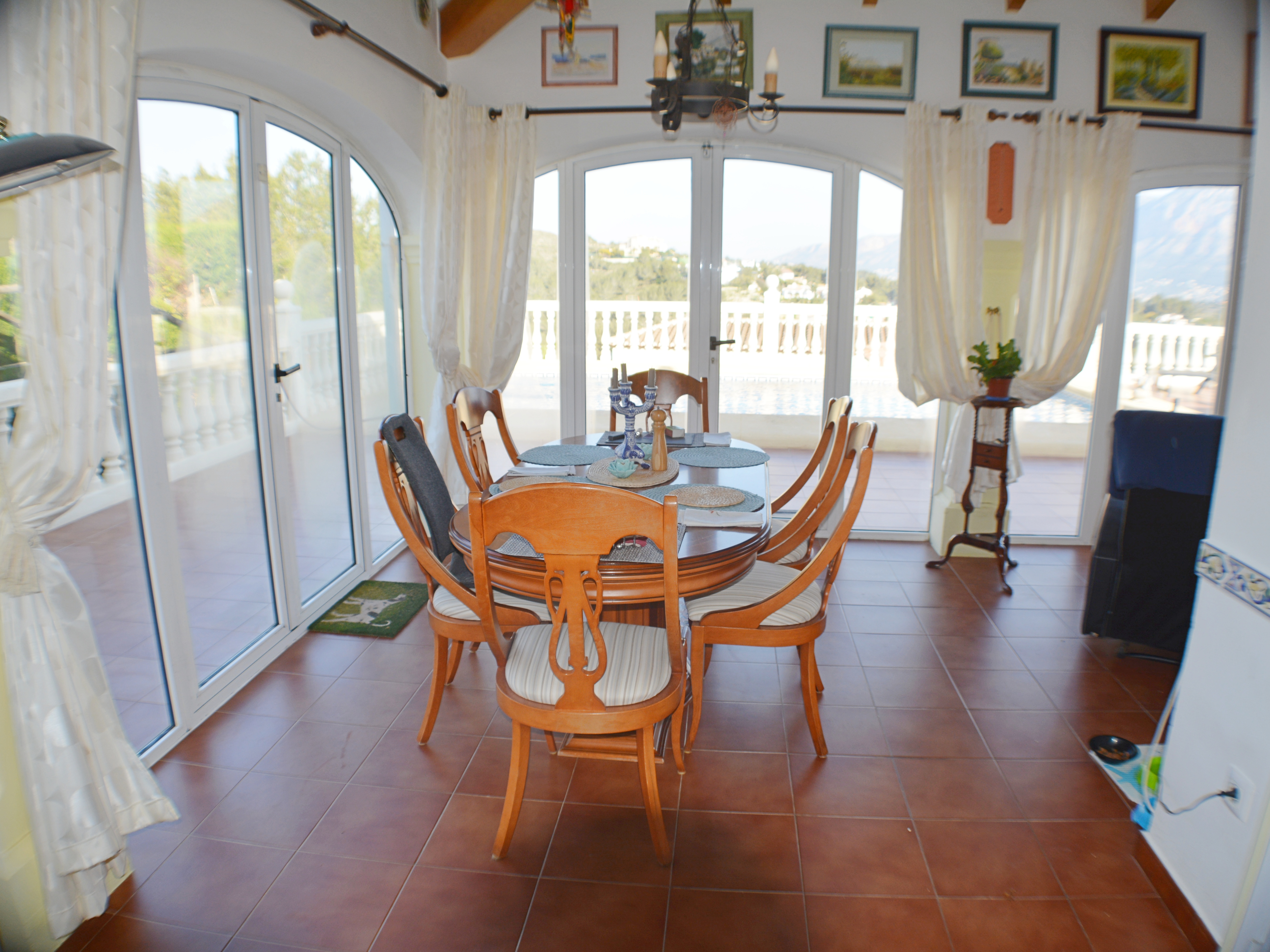 This lovely traditional style three bedroom villa was built in 2000 and benefits from superb panoramic views of the landscape including the famous Montgo mountain. From street level entry is via attractive gardens leading to the the main entrance and hallway. To the left is a spacious independent kitchen which gives access to the impressive L shaped glazed (terrace (naya). From the hallway you pass the living room with traditional stone fireplace and dining area on your way to the master bedroom with en suite two double bedrooms and a family bathroom. The glazed terrace (naya) opens directly on the the swimming pool terrace with lovely open views. A sloping driveway leads to a carport garage and utility room (complete with toilet) offering scope for further development underneath the main house and there is also a well equipped summer kitchen.