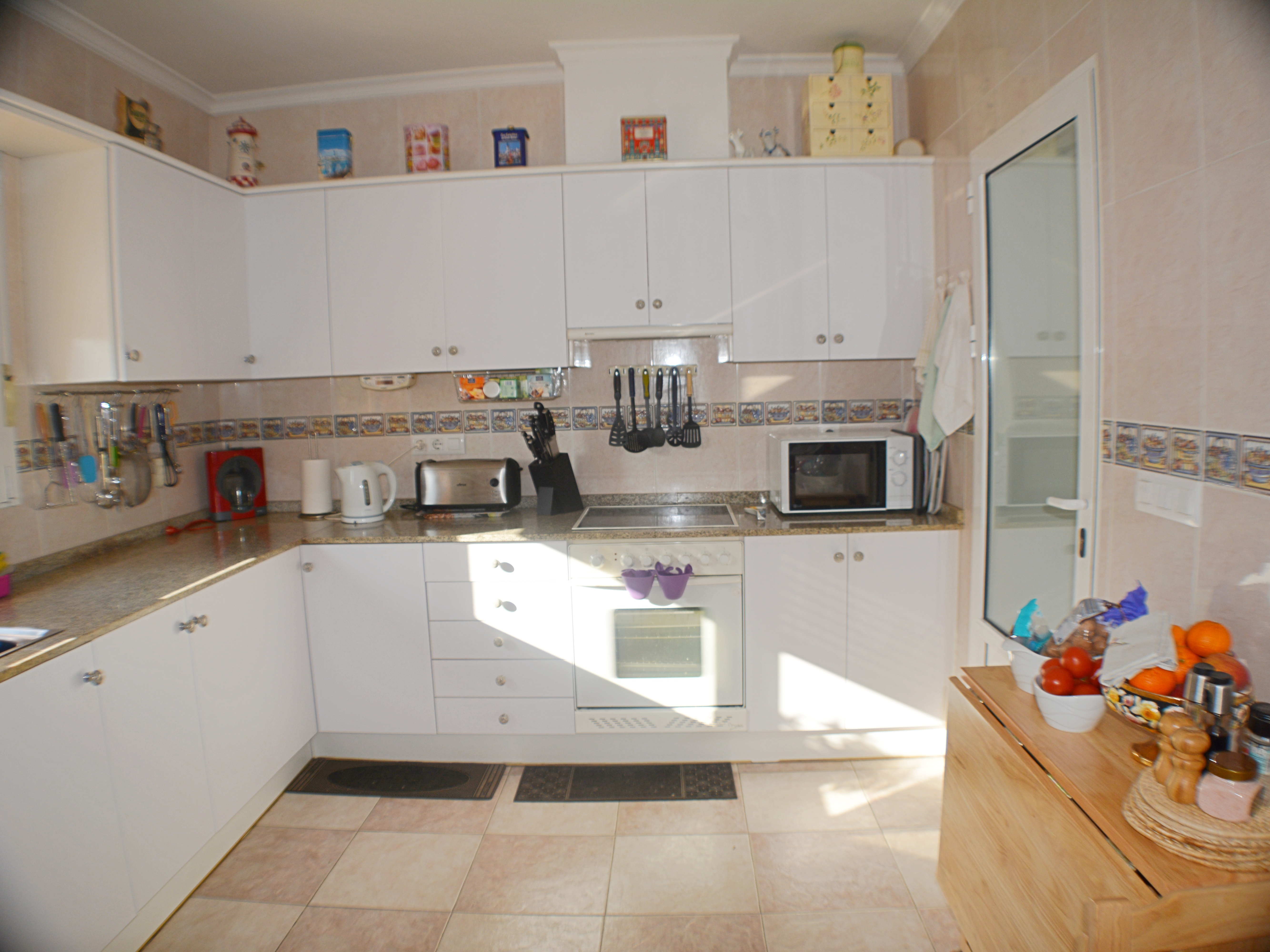 This lovely traditional style three bedroom villa was built in 2000 and benefits from superb panoramic views of the landscape including the famous Montgo mountain. From street level entry is via attractive gardens leading to the the main entrance and hallway. To the left is a spacious independent kitchen which gives access to the impressive L shap...