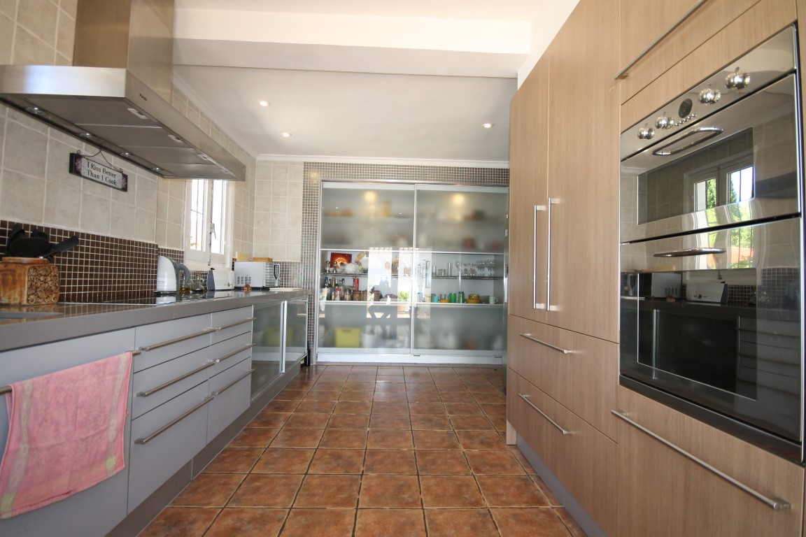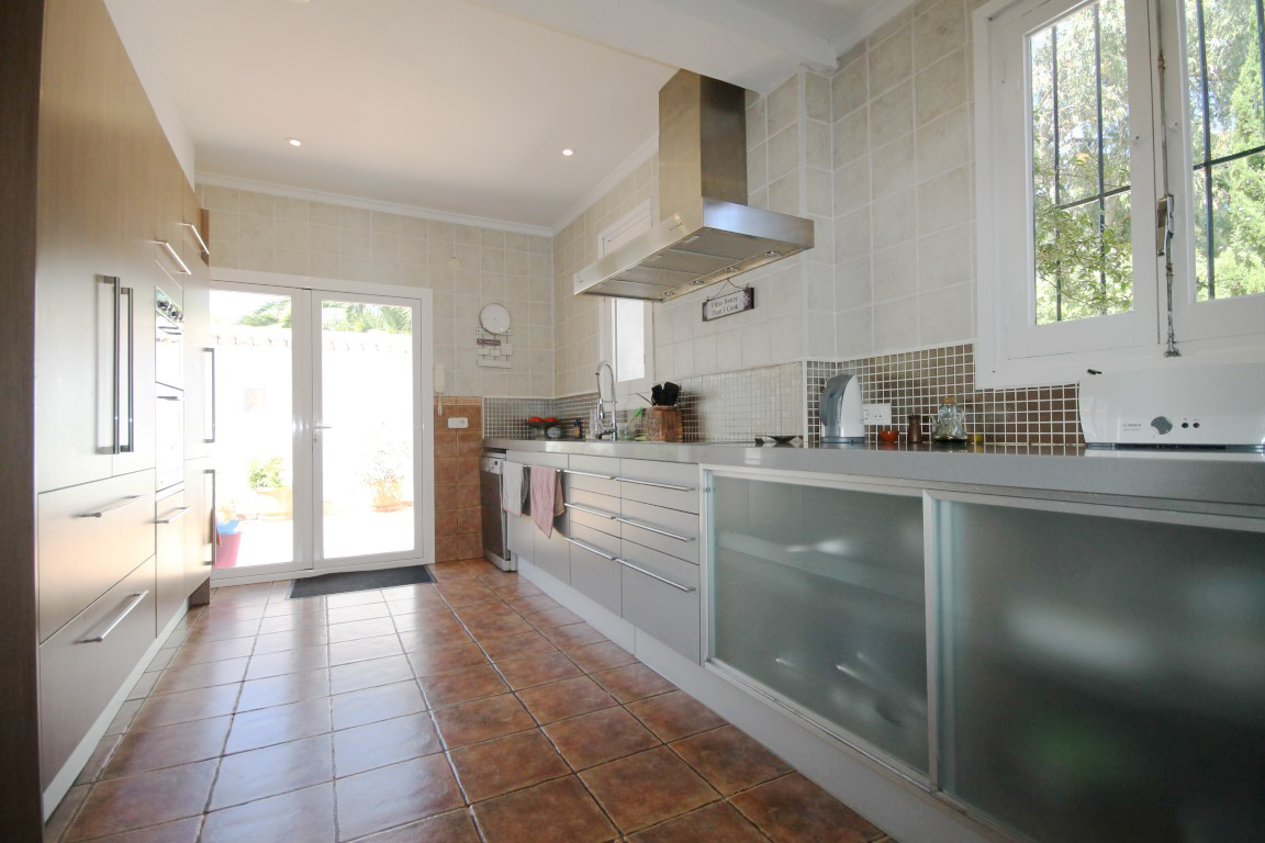 For Sale: This substantial villa is located in the Montgo Castellans area close to the town of Javea. The main living area possesses a glazed naya a vast living room with beautiful Baro Terracotta flooring and a large independent dining room which leads to a pretty courtyard. There are two bedrooms a small office and one bathroom on this level plus a recently renovated luxury kitchen plus the pool and summer kitchen. On the lower level there is a garage with internal access plus a further two bedrooms and bathrooms. The tri level plot is elevated giving it lovely open views and privacy. The gardens are low maintenance whilst boasting many beautifully typical Mediterranean plants trees and palms.