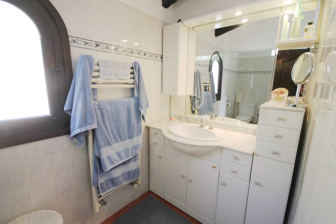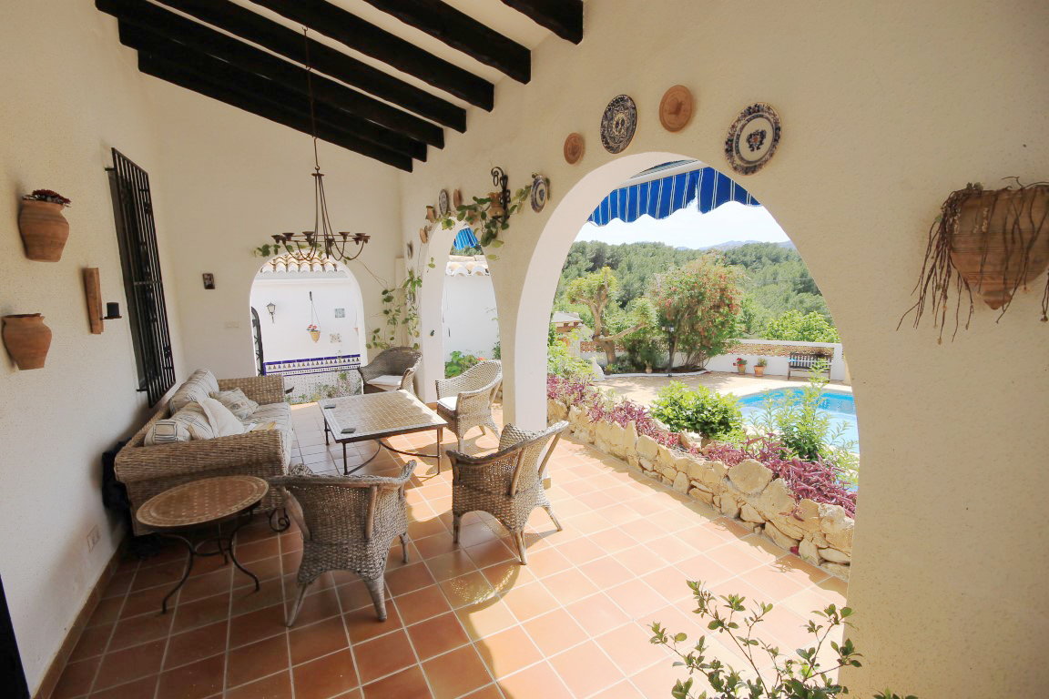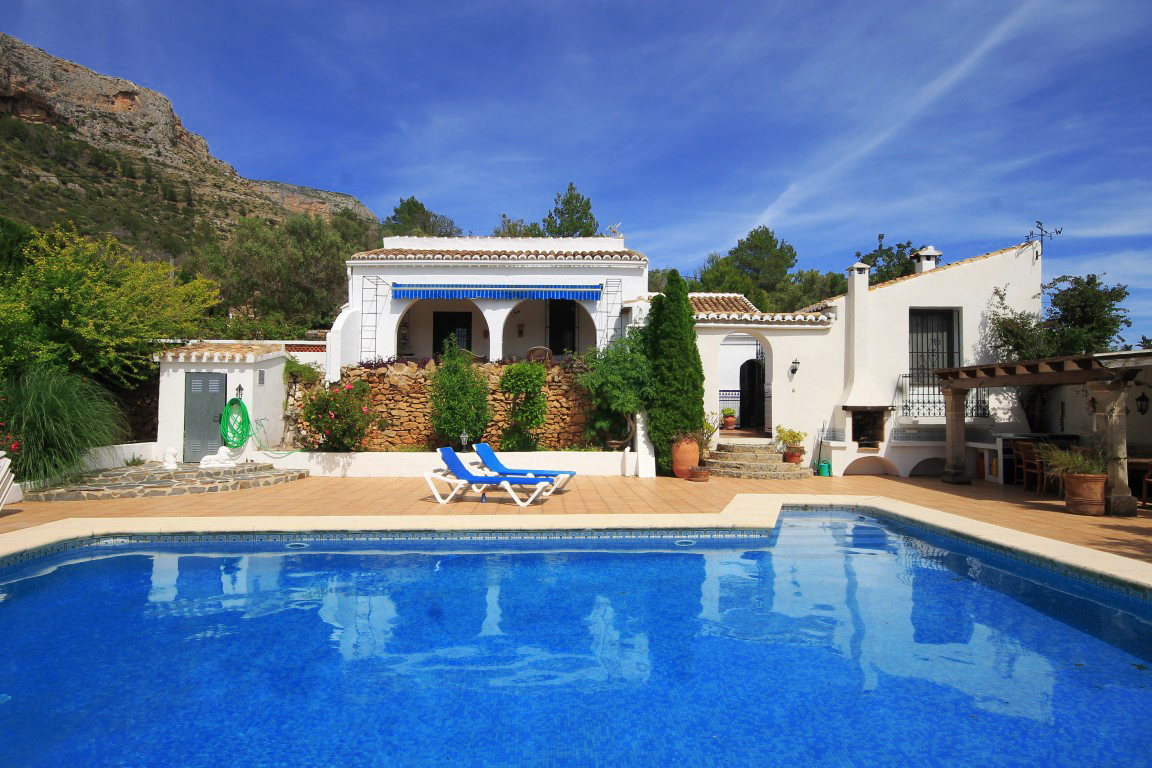 For Sale: Steeped in history this property standing on the Montgo Natural Park enjoys a real countryside feel with stunning country and mountain views and near the quaint village of Jesus Pobre. The finca is distributed primarily over 2 levels. Entering through the honeysuckle framed naya you come across the propertys name sake the magnificent carob tree. You enter the property via the kitchen which was refurbished 5 years ago and is fully fitted with integrated appliances. There is a large lounge/diner and a few steps down to an office and access to an Andulacian style courtyard. The bedroom on this floor is currently being used as a dining room. On the upper level beyond a landing area is the 2nd guest bedroom family bathroom utility room and a master bedroom with en suite bathroom together with access out onto the large west facing naya with views over the La Sella hotel and the hills beyond. The garage used to house a donkey in the last century while solar panels provide hot water for at least eight months of the year. The bottom terrace has a petanque (boule) court. There are various shady and sunny spots to enjoy the area around the large freeform pool including a covered pergola and built in BBQ grill. The villa boasts absolute privacy and views from all aspects. Flower beds frame the pool abundant with roses bougainvillea hibiscus a mock orange lemon tree hibiscuses and other shrubs including a galan de noche. At the rear of the property there is another large paved terrace with a fountain a vine and an old olive tree. A number of terraces above and below the property are covered with almond olive carob and orange trees together with a lime avocado and a prolific fig tree. The top of the property adjoins the old donkey path which leads up the Montgo. Must be seen to appreciate the views and surroundings.