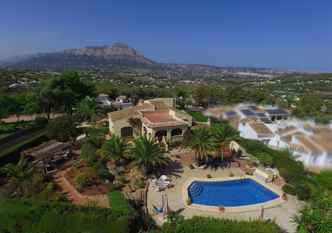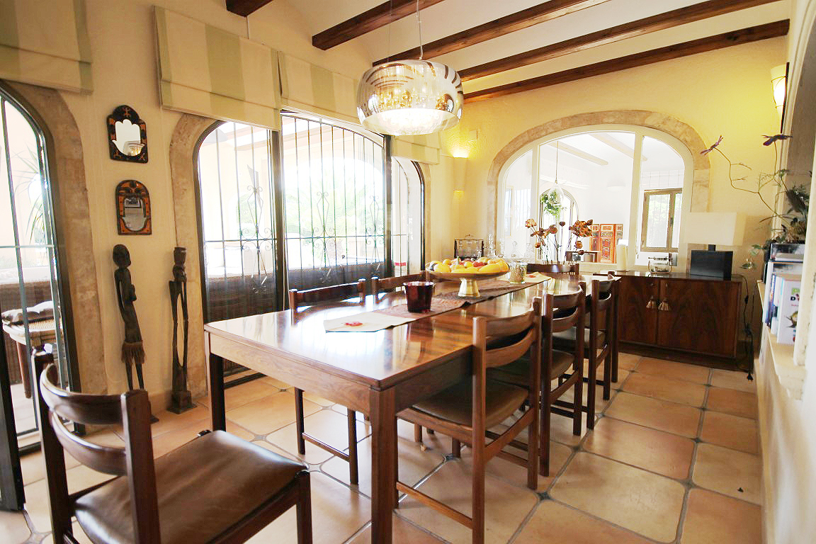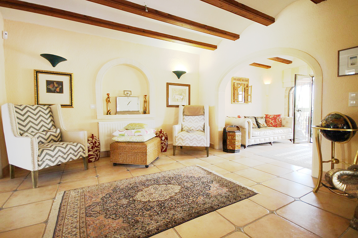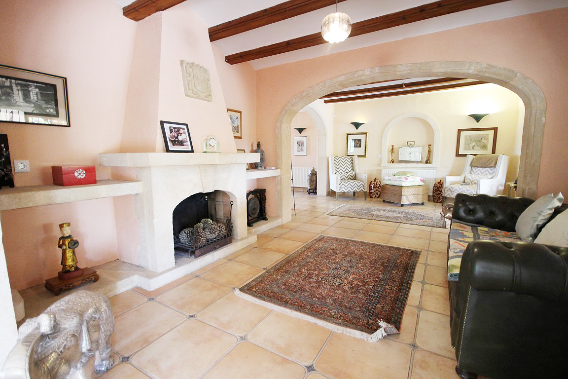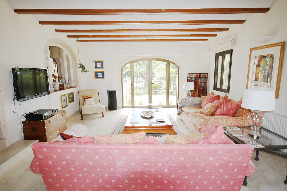 For Sale: Situated on the peaceful upper slopes of the desirable La Lluca Urbanization in a road with no exit this six bedroom villa enjoys open valley views and also towards the Montgo mountain. The plot is bi level with the thoughtfully landscaped low maintenance gardens mostly on the flat featuring various water features and many different areas to relax. With three bedrooms on the main living level including two double suites there are two sitting rooms a recently renovated luxurious kitchen plus a dining room leading to a spacious covered terrace which has glass curtains enabling it to be enjoyed all year round. There are many traditional features such as barrel and beamed ceilings plus the use of Tosca (locally sourced sandstone) combining to nice effect with the more modern bathrooms and kitchen. The lower level is independent and also connected internally here there are a further three guest bedrooms and two bathrooms plus kitchen and also an office cinema room and what is now used as a music room. This area leads out onto the poolside terrace via the fully fitted glazed summer kitchen. The property has been updated and maintained very well over the years by the current owners and is ideal for a holiday home for a larger family or permanent residence.