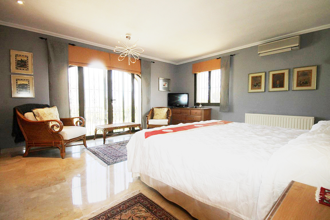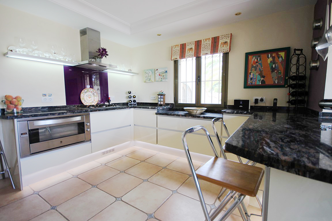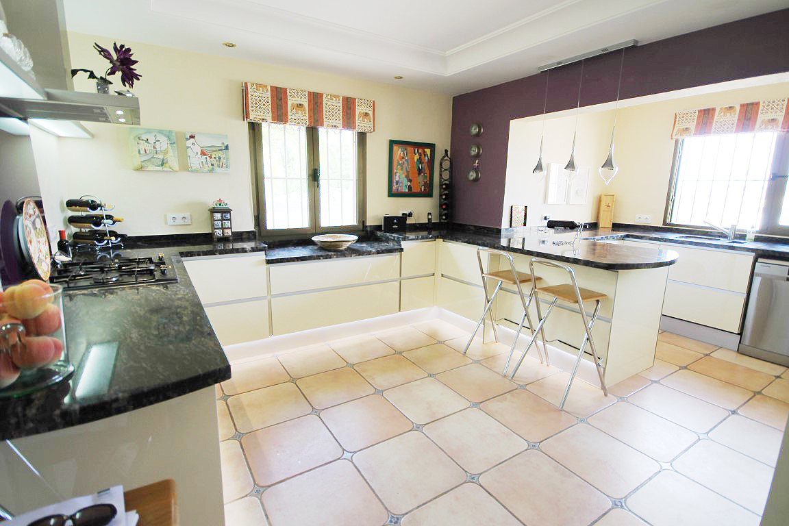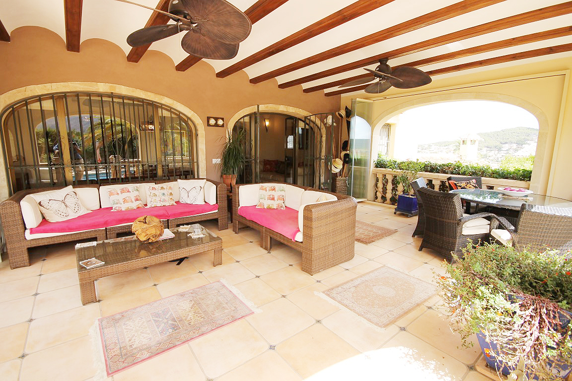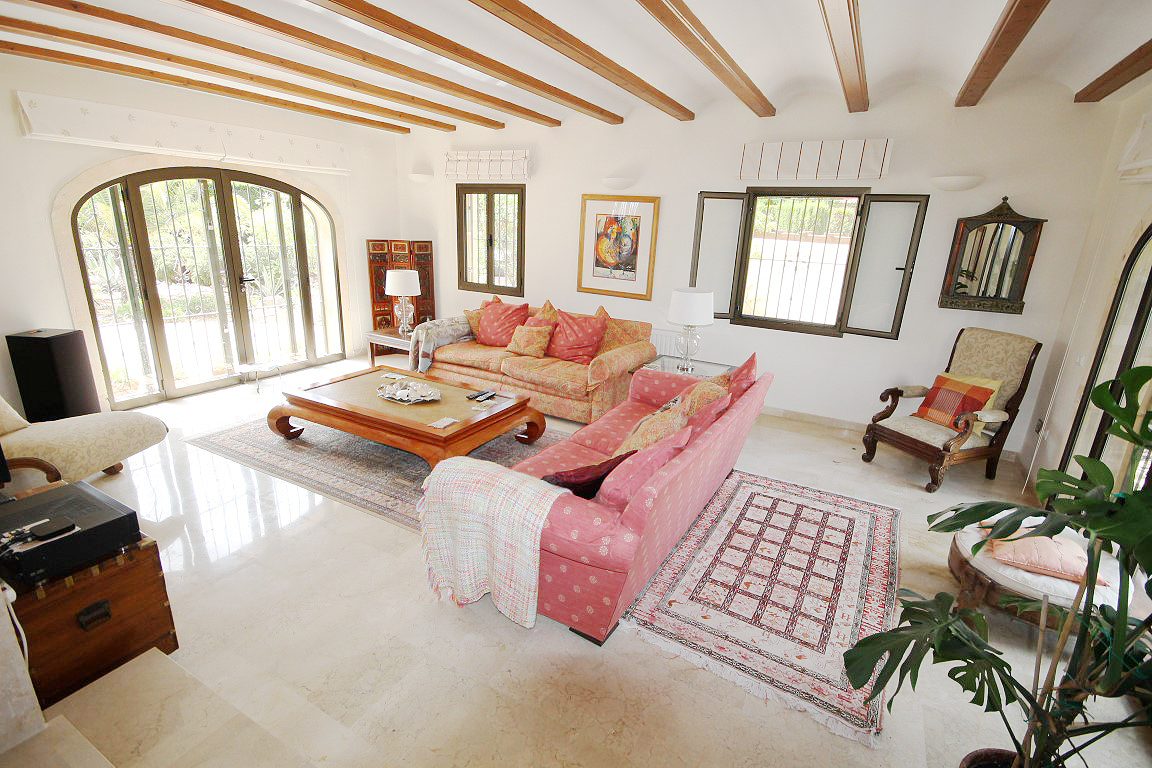 For Sale: Situated on the peaceful upper slopes of the desirable La Lluca Urbanization in a road with no exit this six bedroom villa enjoys open valley views and also towards the Montgo mountain. The plot is bi level with the thoughtfully landscaped low maintenance gardens mostly on the flat featuring various water features and many different areas to relax. With three bedrooms on the main living level including two double suites there are two sitting rooms a recently renovated luxurious kitchen plus a dining room leading to a spacious covered terrace which has glass curtains enabling it to be enjoyed all year round. There are many traditional features such as barrel and beamed ceilings plus the use of Tosca (locally sourced sandstone) combining to nice effect with the more modern bathrooms and kitchen. The lower level is independent and also connected internally here there are a further three guest bedrooms and two bathrooms plus kitchen and also an office cinema room and what is now used as a music room. This area leads out onto the poolside terrace via the fully fitted glazed summer kitchen. The property has been updated and maintained very well over the years by the current owners and is ideal for a holiday home for a larger family or permanent residence.