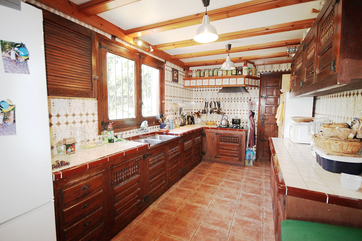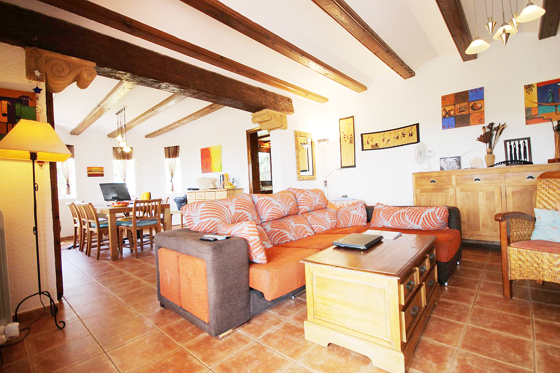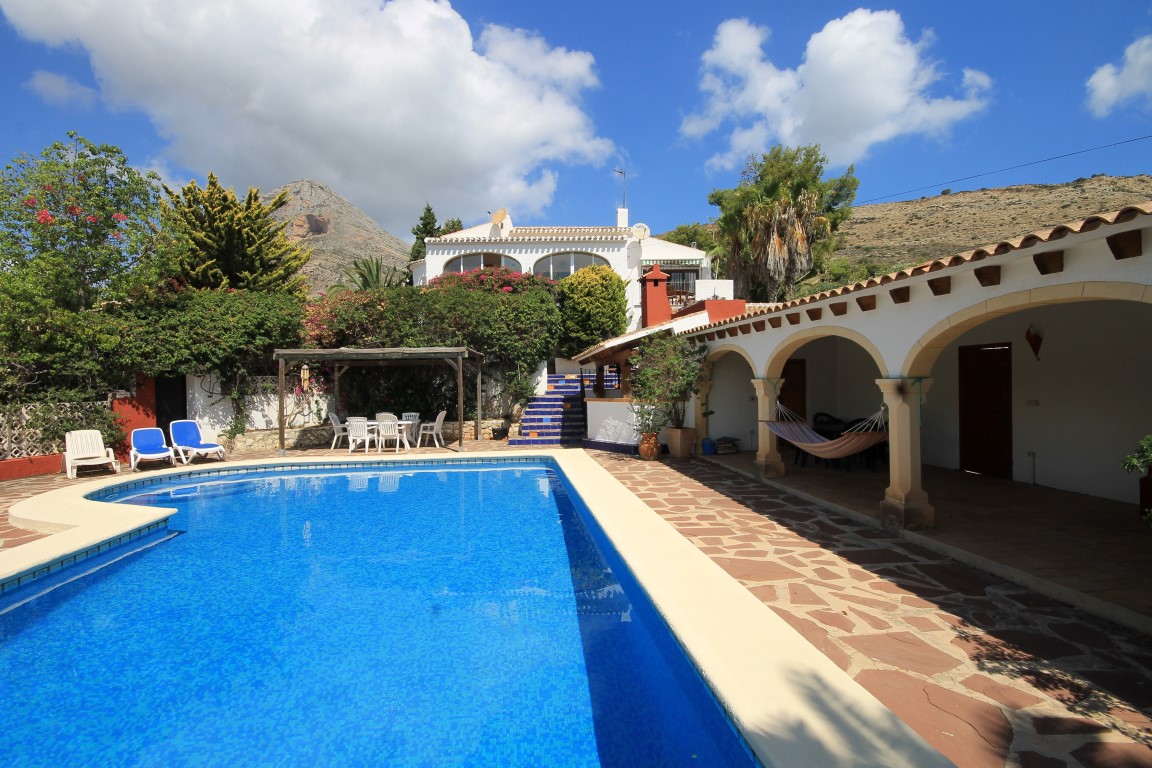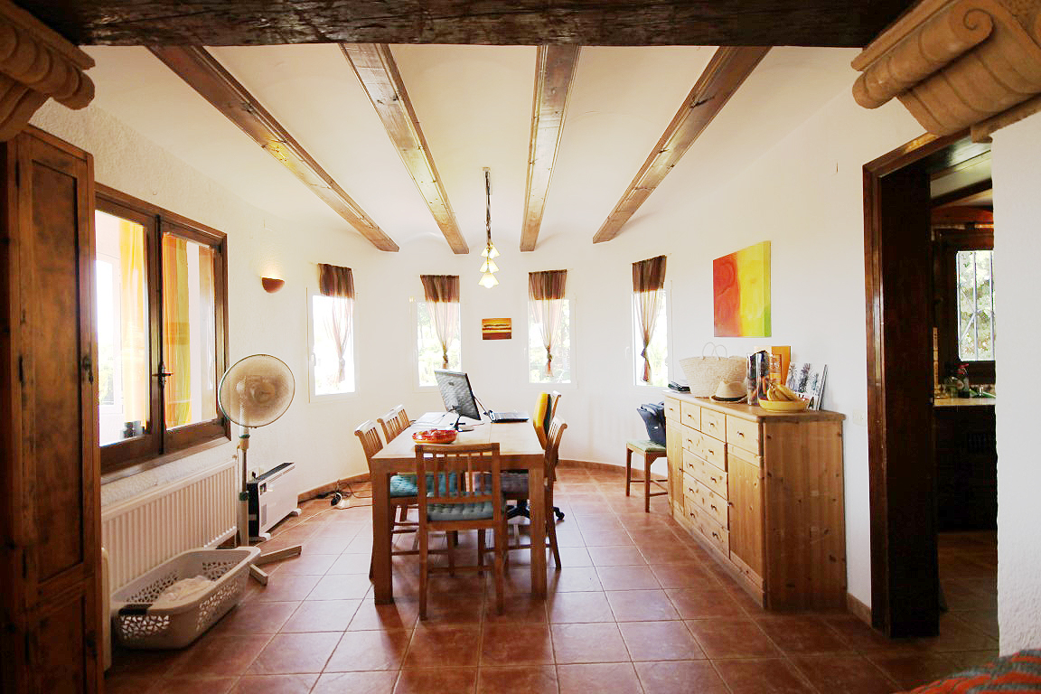 For Sale: Situated in a tranquil and established residential area close to the old town of Javea in the area of Montgo Castellans this 7 bedroom property boasts lovely open valley mountain and sea views. Being elevated and surrounded by privates villas and nature the villa enjoys a good level of privacy. Distributed over two levels independently while also being internally connected the main living area is on the upper floor with 3 bedrooms and a further 4 bedrooms in the lower apartment. The main living area possesses a living room/diner featuring traditional features such as tosca stone work and beamed ceilings while there is a large glazed veranda/naya with sea views. The lower floor apartment consists of an open plan lounge with kitchen plus four bedrooms and two bathrooms. The 10x5m pool with Riu Rau type veranda and summer kitchen offers complete privacy while there is a garage plus decent off road parking.