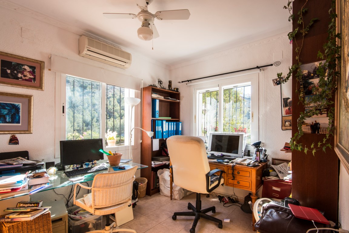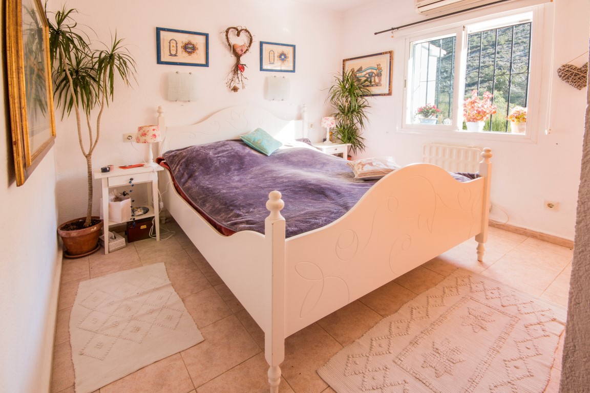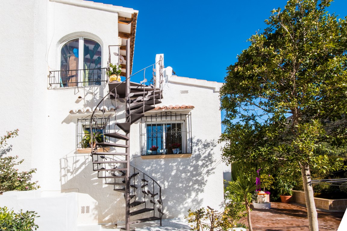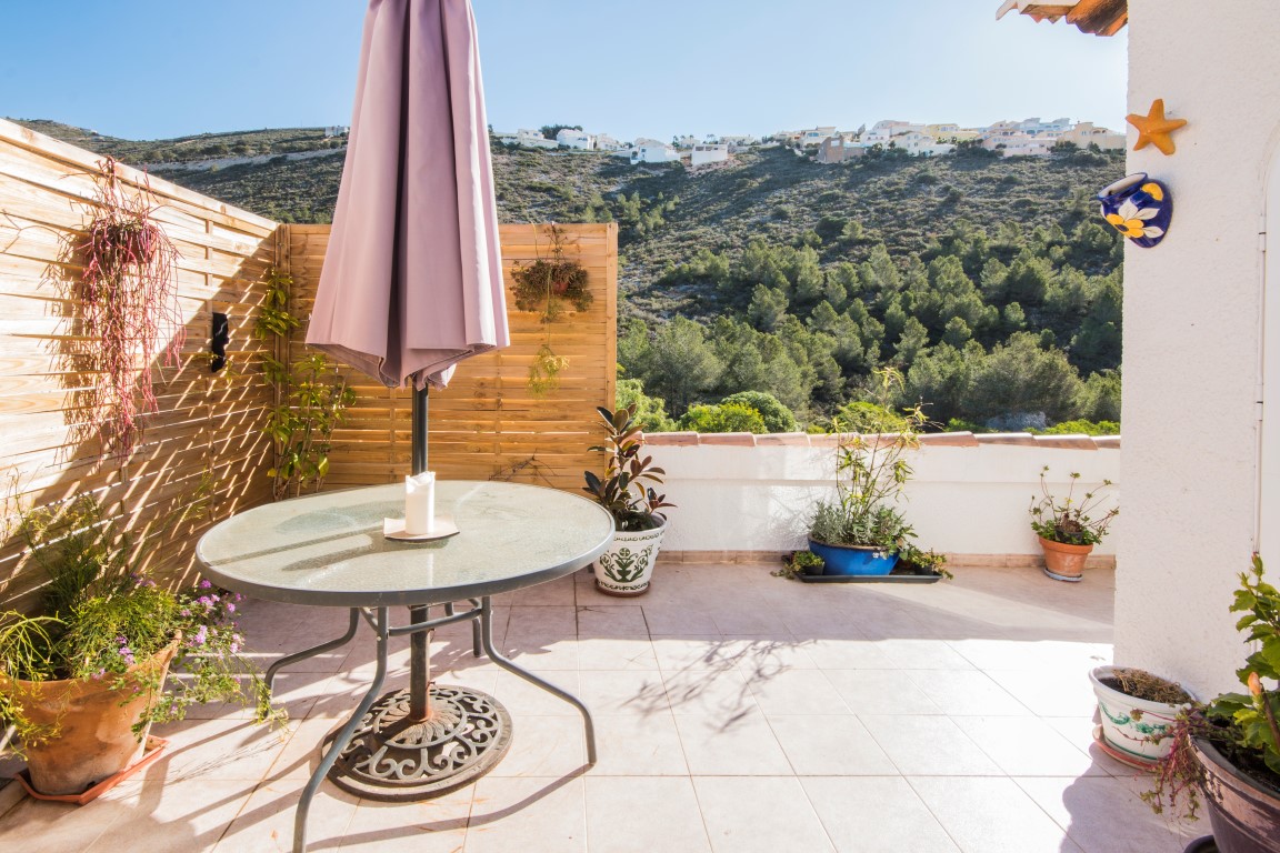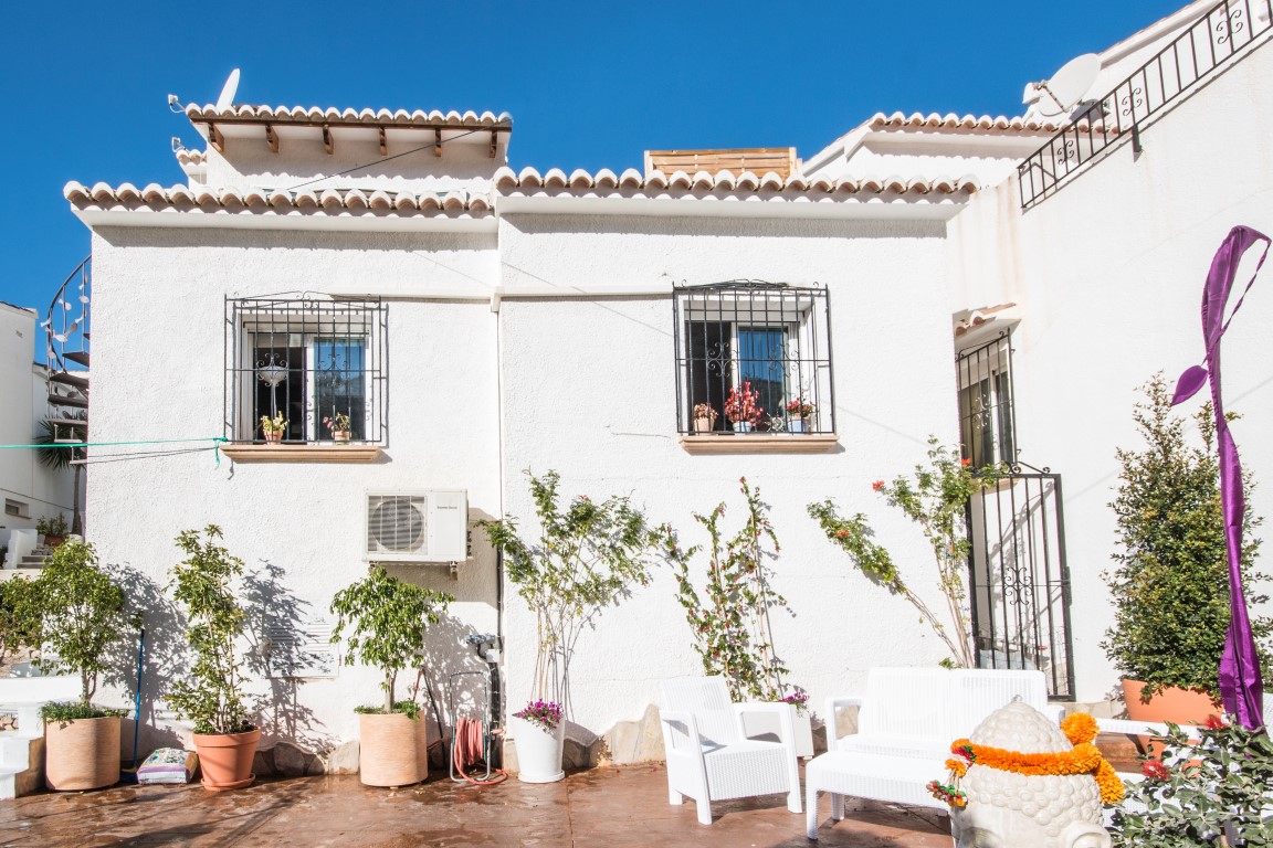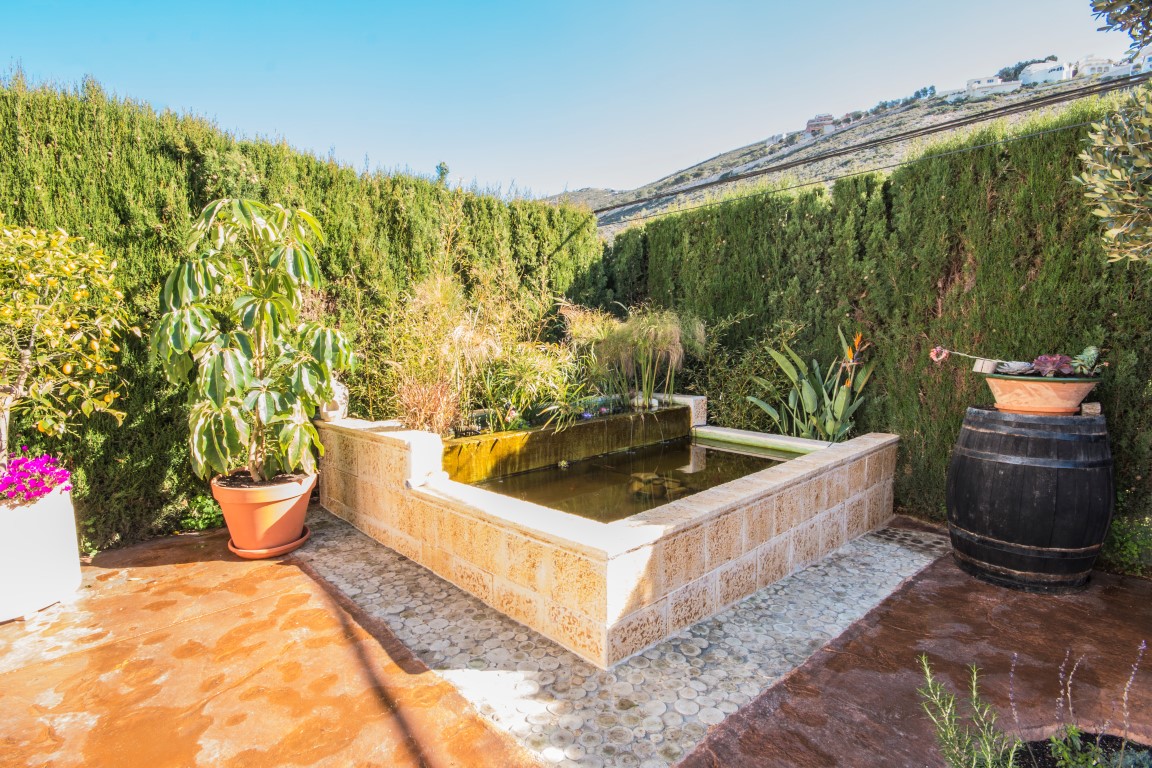 For Sale: Charming house on the pretty complex of Las Alcazres situated between Javea and Moraira. On the upper level is the open plan living/dining room with woodburner stove American style fitted kitchen and showeroom. On the lower level are the 3 double bedrooms bathroom and laundry/storage room. The garden has been landscaped with terracing and gravel beds with ample space for dining and relaxing next to the water feature. The upper terrace offers uncovered dining with a sea view and the glazed naya provides a sunny room to be enjoyed all year round due to the south orientation. The property benefits from air conditioning and off road parking.