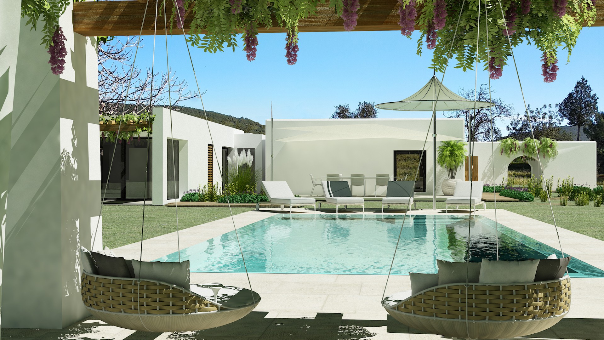Exterior: Pool, chillout, bbq, toilet, terraces, gardens, land with fruit trees and forest area.