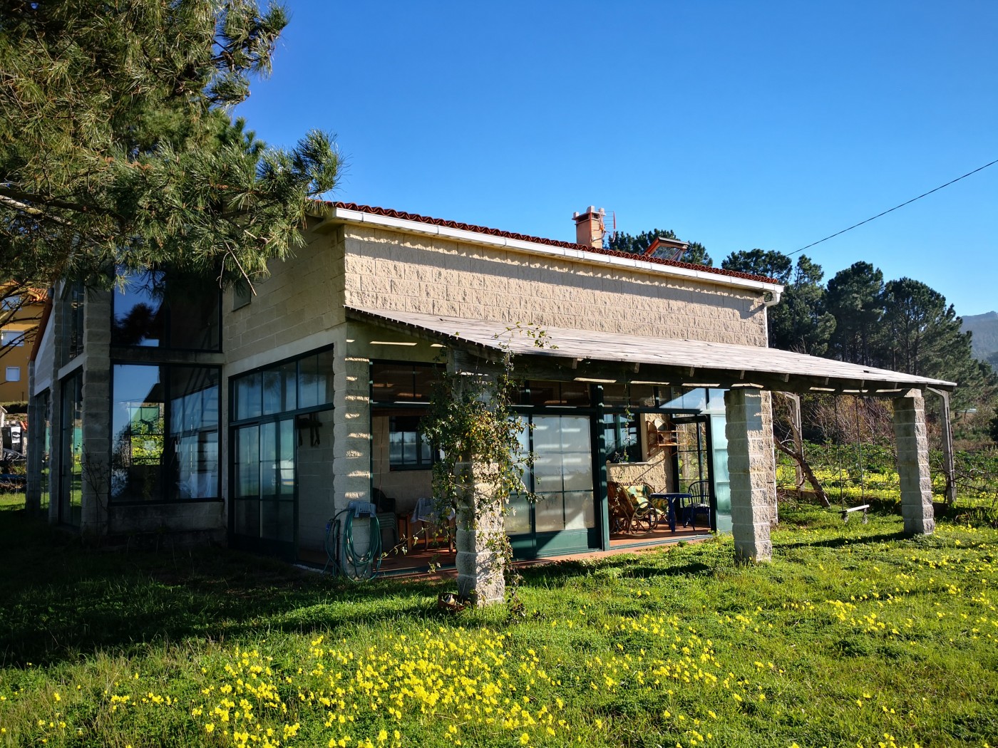 Outside we have a large 1200 m² plot planted with beautiful trees, a roofed garage, and