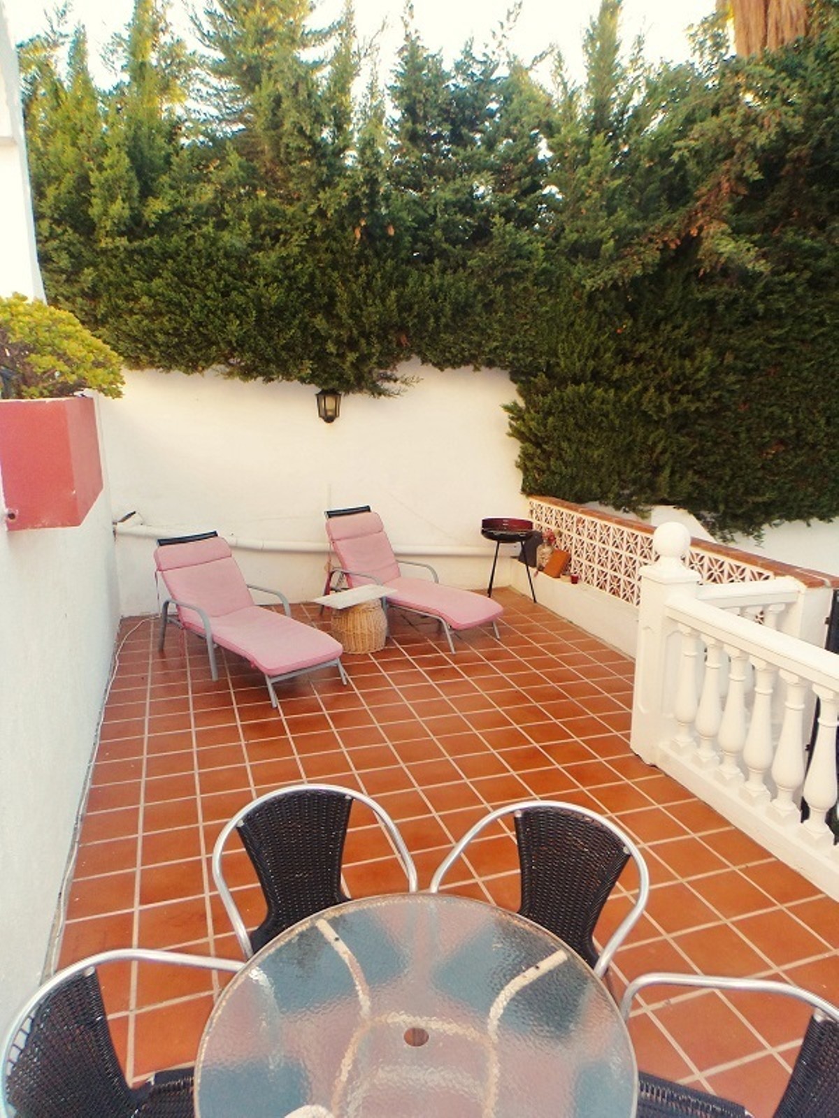split level terrace with built in bbq area, there is plenty of space for table and chairs, sunloungers