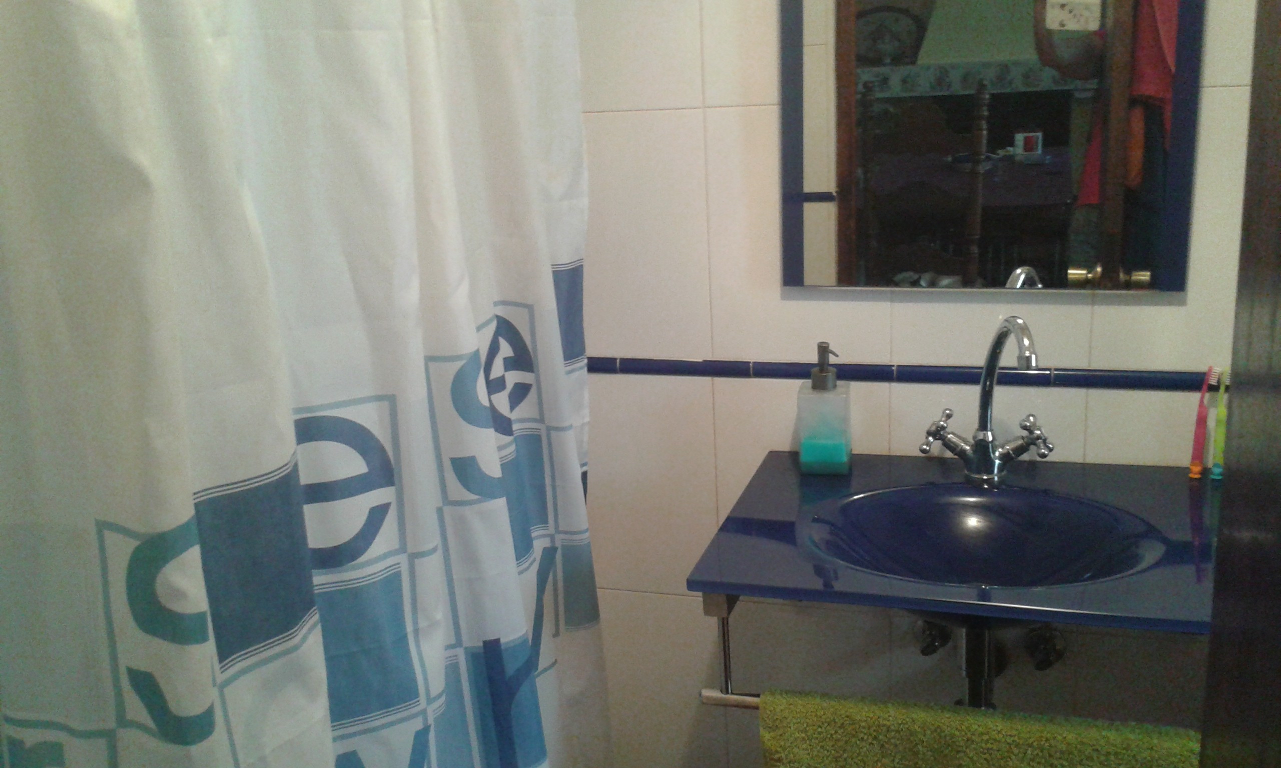 bathroom with shower and a fully equipped new kitchen.