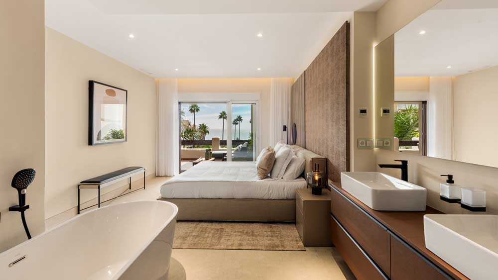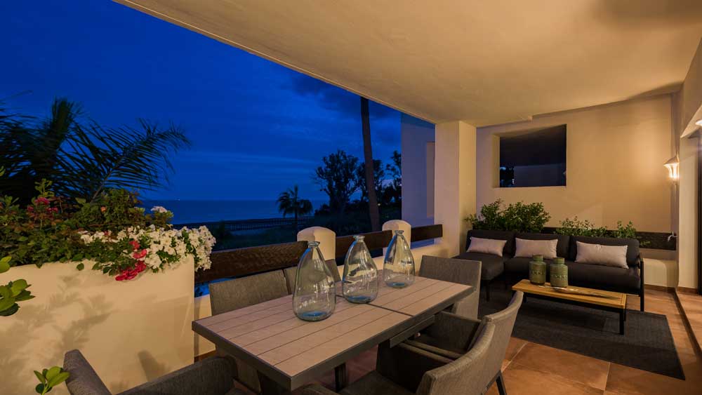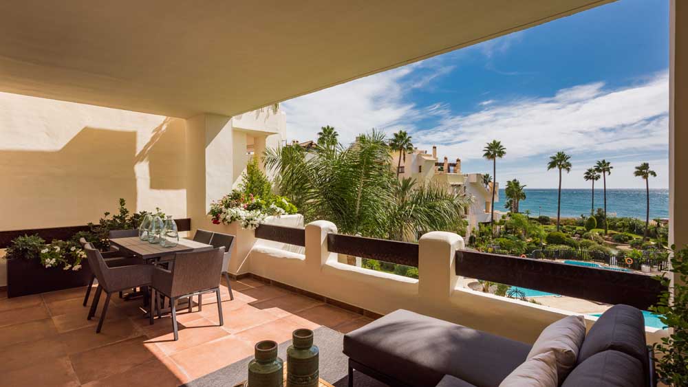 NEW GOLDEN MILE ESTEPONA: Fully renovated top quality 3 bedroom second floor apartment in Bahia del Velerin. Frontline beach south West facing sea views quiet and private. Direct access to the beach. Spacious living and dining area with fully fitted open plan kitchen (Neff appliances). Master bedroom en suite walking closet and two g...