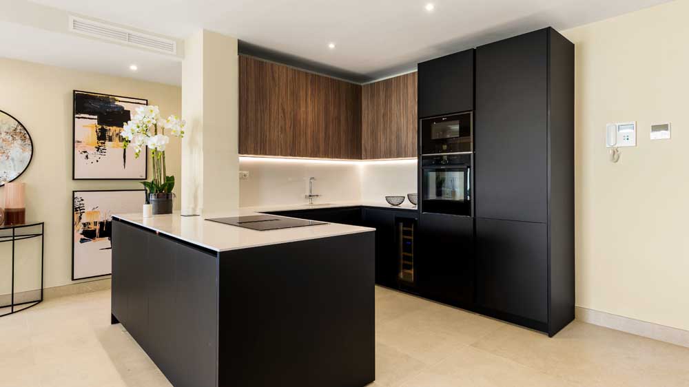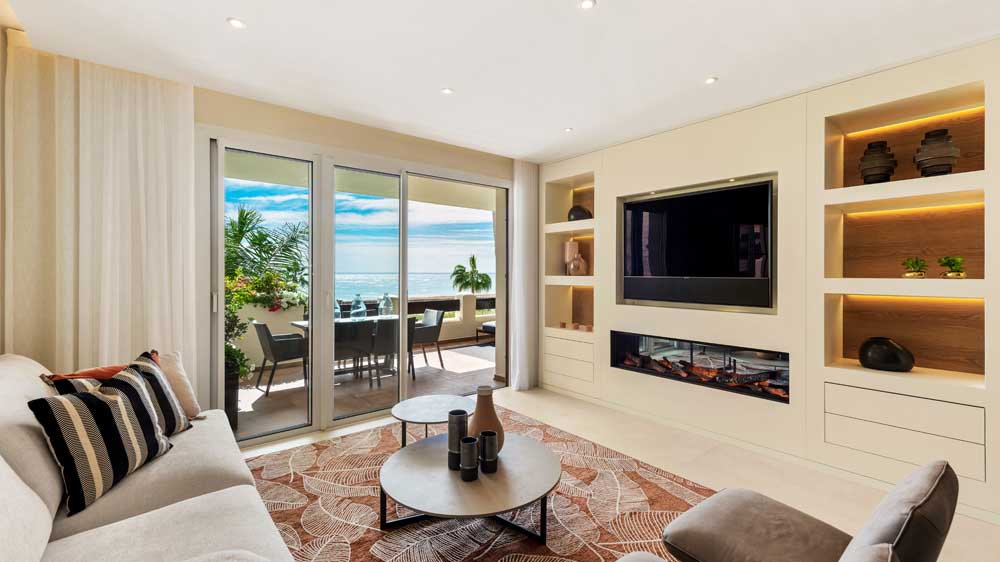 NEW GOLDEN MILE ESTEPONA: Fully renovated top quality 3 bedroom second floor apartment in Bahia del Velerin. Frontline beach south West facing sea views quiet and private. Direct access to the beach. Spacious living and dining area with fully fitted open plan kitchen (Neff appliances). Master bedroom en suite walking closet and two guest bedrooms sharing a bathroom. Underground parking and storage. Direct access from the living areas to a large terrace and the communal nature and lush gardens and community pool. Great location next to the famous chiringuito El Velerin and walking distance to Laguna Village. Less then 5 minutes drive to all amenities. Furniture included in the price.