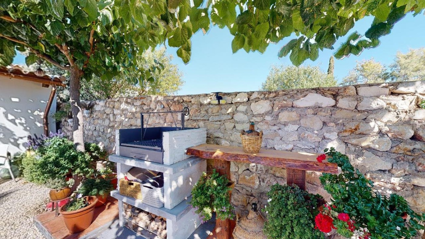 the right is a hand build stone wall with 3 mature mulberry trees, bay tree, plus perfect shade on