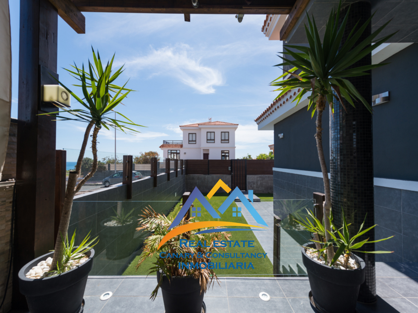 The villa is situated on a south-facing lot, providing stunning views of the ocean and Meloneras