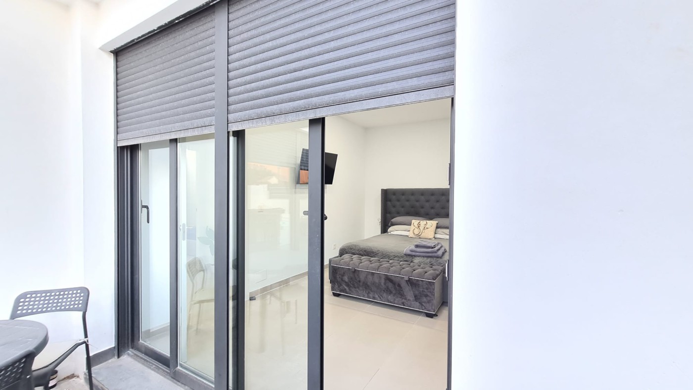 shower. The master bedroom is fitted with sliding patio doors which leads onto the private pool