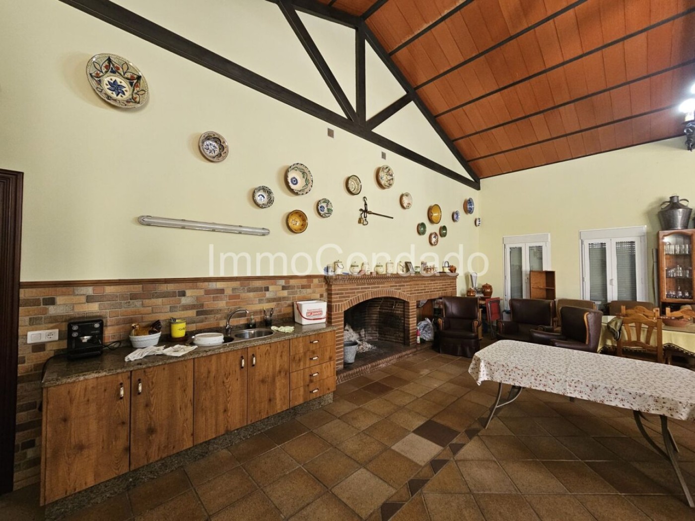 and is completely tiled. Next to the garage is the 100 m² pool. The owner has built a bar on