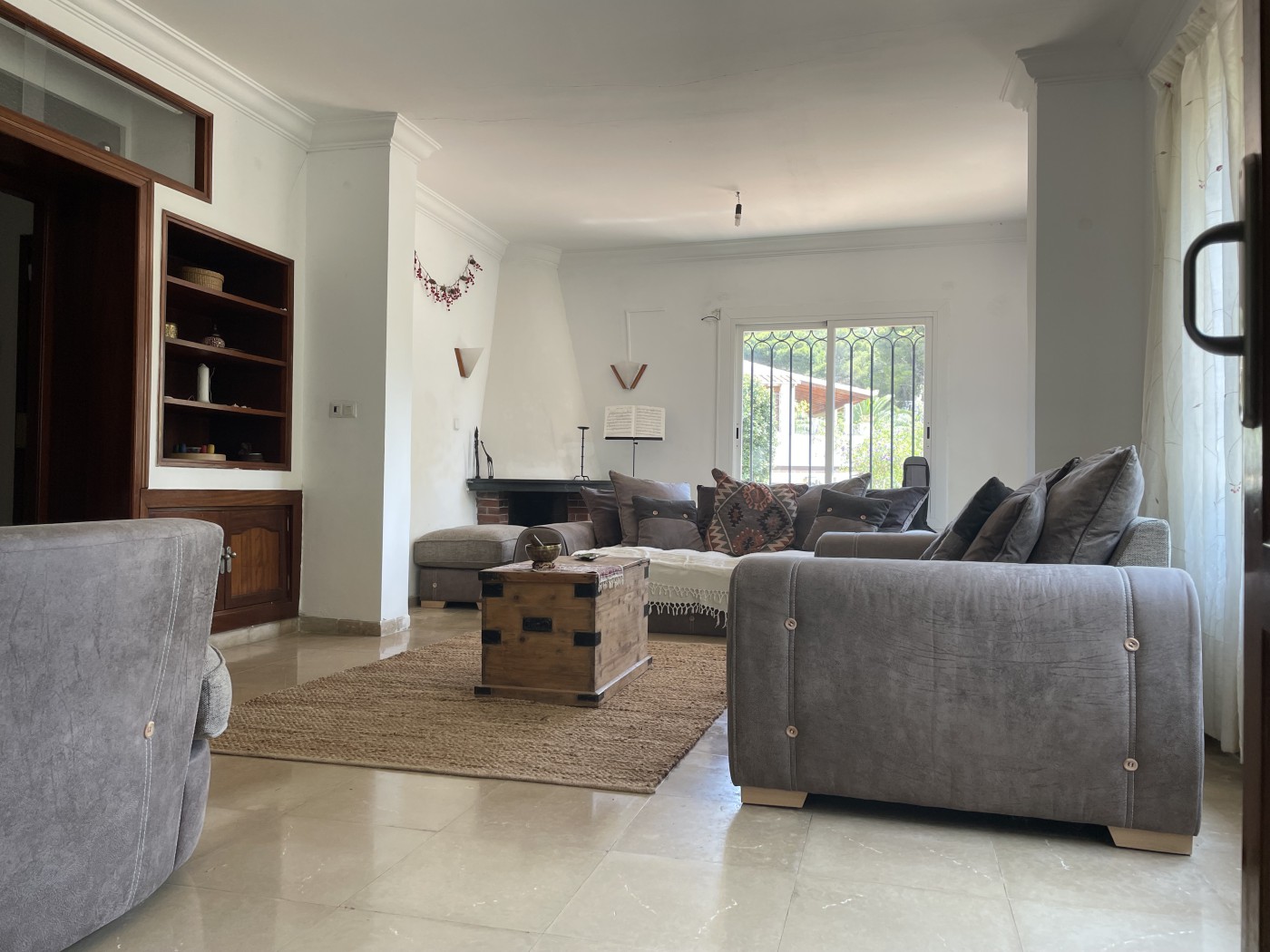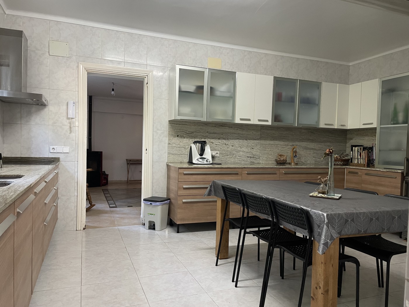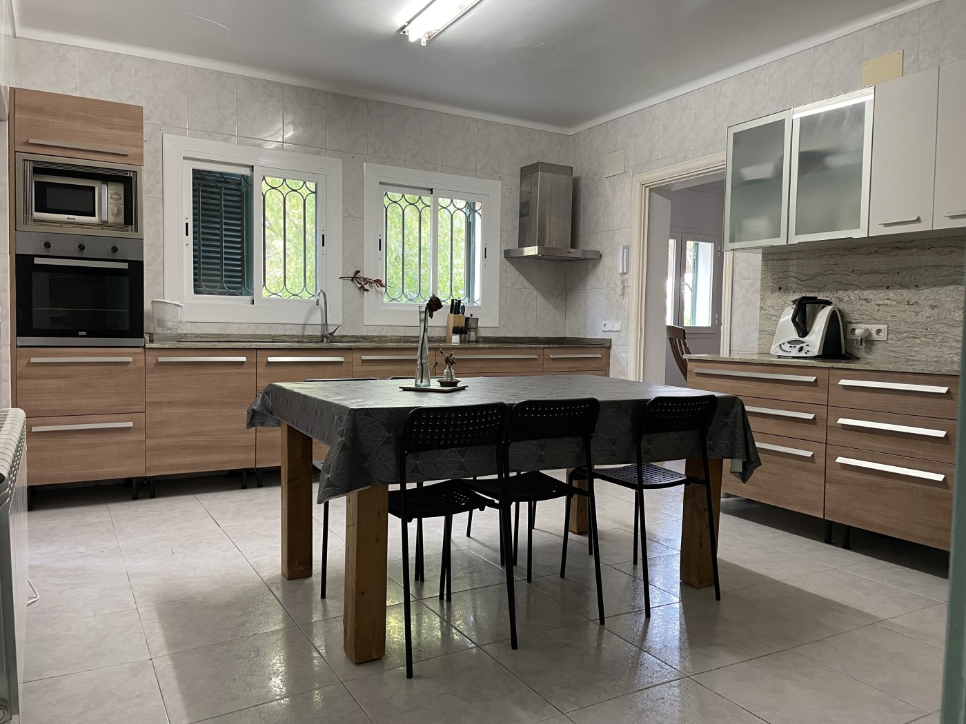 eine große möblierte und ausgestattete Küche, ein Wohnzimmer mit Zugang zum Garten und