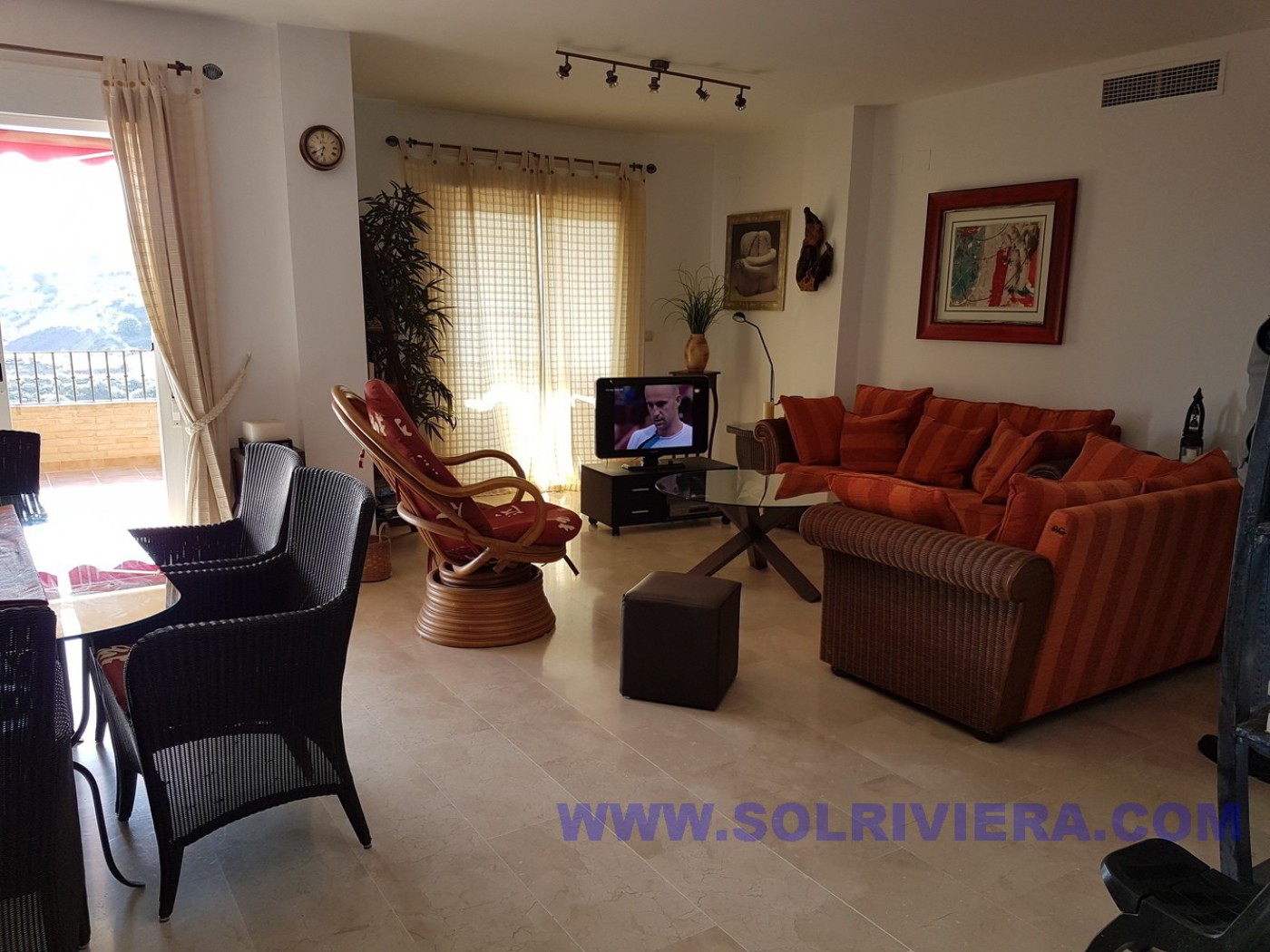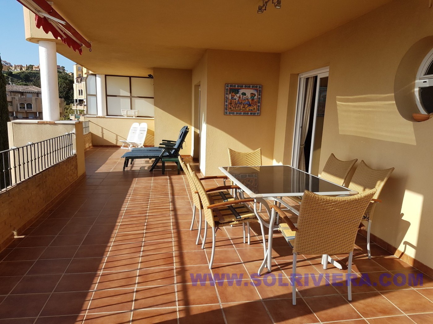 2 Fully equipped apartments united- in- one, on a corner, beautiful, spacious, bright, with breathtaking panoramic views from a surprisingly large terrace (sun in the afternoon). It has a lovely, spacious sitting-dining room, 4 bedrooms with the possibility of a 5th one, 3 bathrooms and 1 guest toilet. Marble floors. Climalit windows. The kitchen also has a big terrace (sun in the morning). The property can be converted into 2 separate apartments, as there are 2 Title Deeds, 2 main doors and 2 fully fitted kitchens. Cold and hot air conditioning in living-dining room and bedrooms. 2 individual garage spaces with 2 storage rooms. Ready to move in! This is a different property from what you normally would expect! Ask us to show you! Ideal access for people with reduced mobility. The residential complex has a paddle court and two swimming pools with nice gardens, all well kept. In a quiet residential area, near the Golf Club and tennis club. Located between Marbella and Fuengirola, Bus and taxi in the urbanization itself. With all kinds of services, such as supermarkets, restaurants, bars, fitness centre, access to the beach, etc. 35 km from Malaga airport and with access/ exit of the AP7 toll road and the A7 motorway in the same urbanization. In a quiet residential area, situated between marbella and Fuengirola, close to the Golf and tennis club. Close to the bus stop and the taxis in the same urbanisation, it also have all kind of facilities like supermarket, restaurants, bars, gym center, direct access to the beach etc.. at 35 km from Malaga airport.