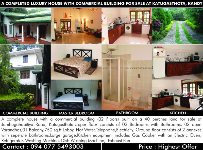 40 perches of land with house. House includes 4000 sq. Feet, 03 bed rooms with bath rooms, 02 open verandahs , 01 balcony,750 sq. Feet lobby, hot-water, telephone, electricity, water supply, large garage, security wall around the whole es includes 500 sq. Feet & 02 separate bathrooms mercial building includes 750 sq. Feet (each Floor), 02 floors. 2.5km from Katugastota town. Kitchen equipments include washing machine, dish washing machine, exhaust fan, refrigerator and gas cooker with electric oven.