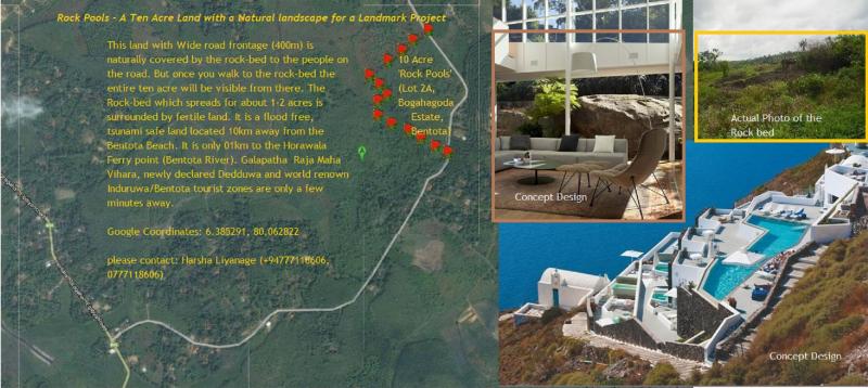 This is a ten acre land consists of a rock-bed/cliff which spreads for about 3 acres. This land is located 10km away from the Bentota Beach towards the beautiful HORAWALA area..