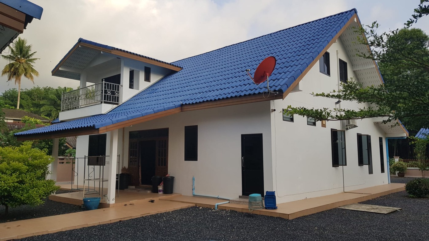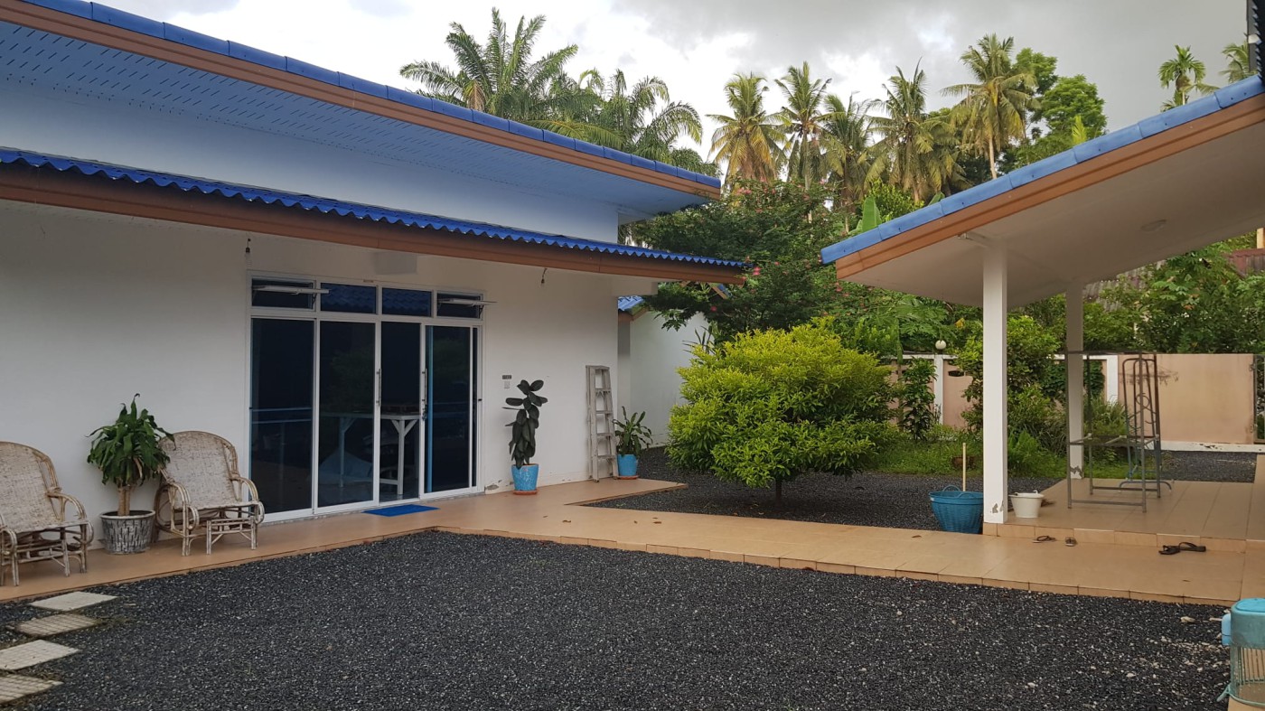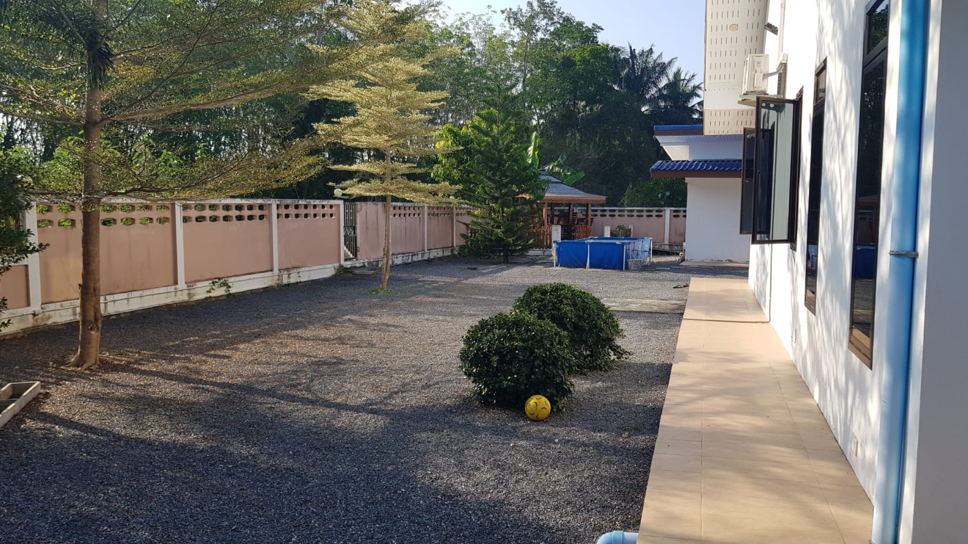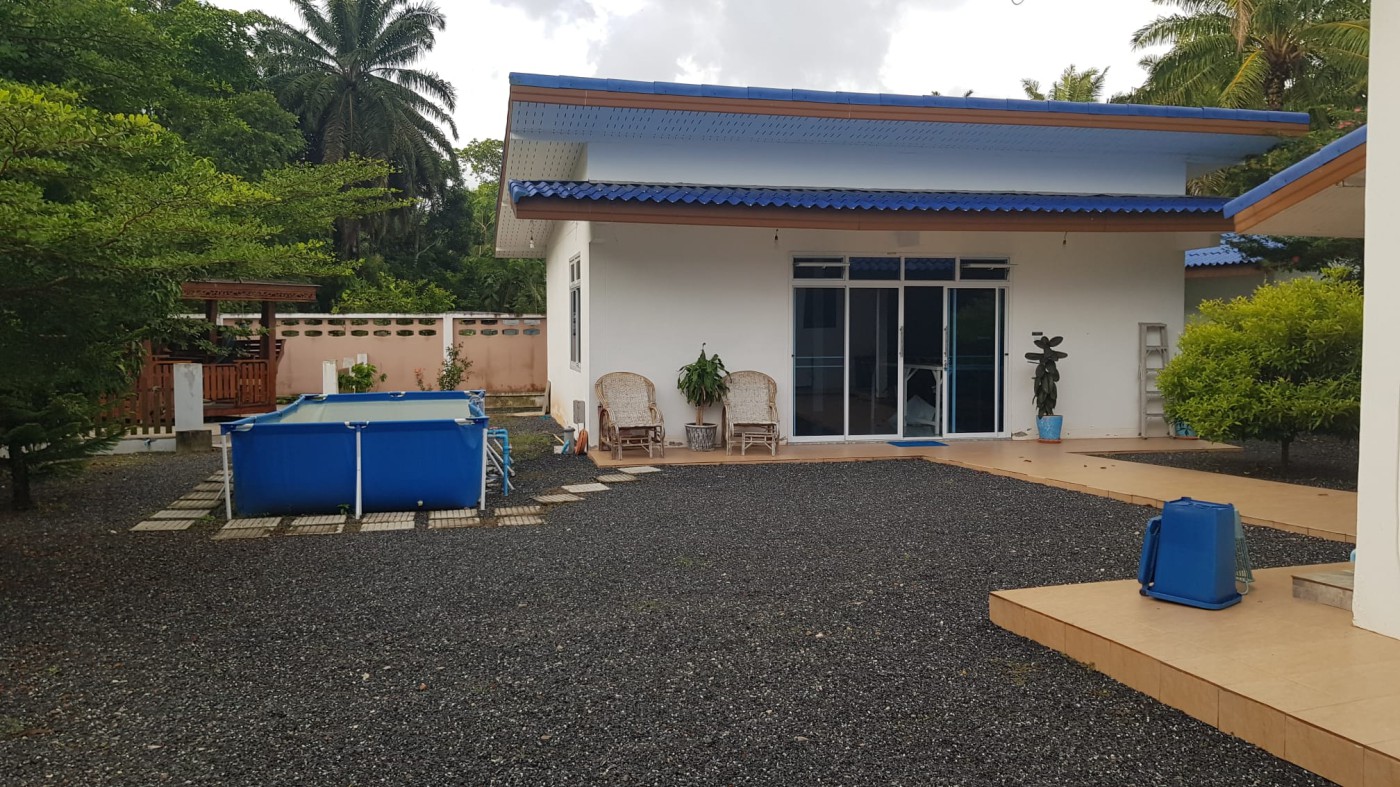 Discover a secure walled estate in Khlong Phon, Khlong Thom, Krabi, just 25 minutes south of Krabi International Airport. This two-story family home offers a four-bedroom main house (200 sqm) with three bathrooms (two en suite) and a separate self-contained one-bedroom apartment with en suite and sitting room (56 sqm). The property sits on 700 sqm of land and includes a double garage (56 sqm) plus a separate carport.