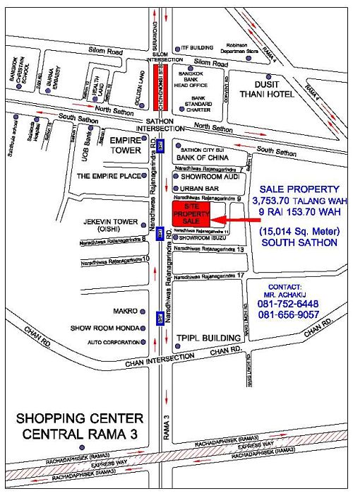 PLEASE FIND THE DETAILS OF THE PROPERTY AT NARATHIWAS RAJANAKARINDRA 9 � SATHON ROAD BELOW: 1. TOTAL AREA OF 3,753.70 SQUARE WAH = 15,014 Square meters (9 RAI 1 NGAN 53.70 TALANG WAH) 2. PROPERTY IS IN THE BUSINESS AREA AND EASY ACCESS TO SATHON ROAD, SILOM ROAD, AND RAMA 3 ROAD 3. NEAR BANGKOK SKY TRAIN (BTS STATION: CHONGNONSI) AND BRT (BUS RAPID TRANSIT) TOTAL OF 17 STATION ON BRT SATHON-NARATHIWAS/RAMA3 ROUTE 4. NEAR TO SHOPPING CENTER CENTRAL DEPARTMENT RAMA 3, SUPER MARKET TESCO LOTUS, SUPER MARKET MAKRO, AND BANKS 5. PROPERTY IS CLOSE TO EMPIRE TOWER, SATHORN CITY TOWER AND BANGKOK CITY TOWER 6. THE PROPERTY IS IN THE RED ZONED FOR COMMERCIAL PURPOSE AND RESIDENTIAL DEVELOPMENT BY REGULATION COMPREHENSIVE BANGKOK METROPOLITAN CITY PLAN. 7. GOOD INVESTMENT FOR HOTEL, HIGH RISE BUILDING, CONDOMINIUM AND ETC.