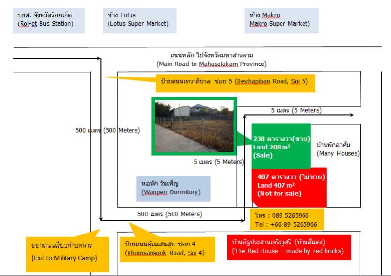 Other related information - The Land is in Roi-et City, Thailand and many houses is around the land. - The Land is near convenience stores including Lotus Supermarket, Makro Supermarket. - The Land has already get public utilities including electric, water and scupper. - The entrance to the land is tar road and concrete road. - No flood. - The Land is opposite site to the Red House (Made by red bricks).