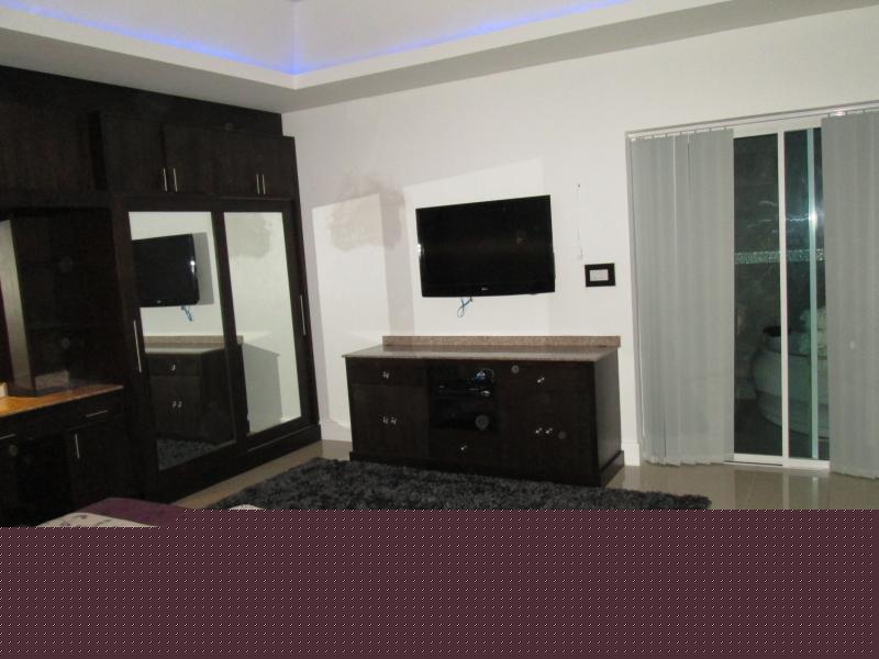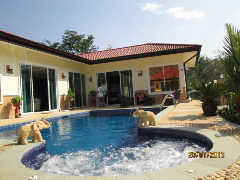 Vanity units,mirrors,make up light. Shaver-point with blue all round led lights and white down lighters, extractor fan,bedrooms are fully furnished with built in walnut wardrobes floor to ceiling with full length mirrors on sliding doors, vanity units with make up lights and mirror, power point 2king size size beds fully fitted (1per room) TV unit and draw set. Blue led up lighter white down lighters, ceiling fans -Fi points fitted .3th bedroom faces pool and garden 4th faces landscape garden. Full western kitchen fitted with built in dish washer 2x1 island all topped with granite work the far end of kitchen. Dining room seat 8 with granite topped table, drink fountain, faces pool and garden. Living room seats 9 people with 60 in plasma screen TV. Blue ray surround sound -Fi points in living room also faces pool and garden all rooms come as standard with blue led up lighter and white down lighter that makes the evening feel cooler. Dining room and living room also as standard fitted with ceiling de 6x8 2 mt. swimming pool with swim into round Jacuzzi will fit a people in, also led lights in pool that can change color to sort any mood plus 2 mt. walls and gated drive way and not over looked with security lights on gates and all round house, gate leads onto lighted road, drive way can fit 4cars 2 under well light carport that leads to washing house has the 4th bedroom and en-suite that has the same spec as all the bedrooms. Water supply comes from well with water filtered water( good well mountain water from ton SAI water falls 1k away)the house is wired to good earth safety standards. Location 6k from t royal marina,4k from beaches, bars, RESTUARANTS ,beach bars, clubs and Laguna complex,1 k from ton SAI water falls and adventure from Tesco`s.,hospital, main shopping plaza and RESTUARANTS police from Phuket sports academy and day school which incorporates 3 hotels RESTUARANTS and sports bar. This is a good location for the sport minded the relax and party person peaceful at night but not to far from the night life, good for walks and children nice safe place