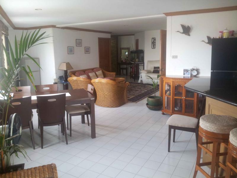 Large 2 bedroom, 2 bathroom condo located 100 meters from the beach in Pratumnak Hill, an area known as the `Beverly Hills` of Pattaya. 127 square meters inside floor space, 5th floor corner unit, 2 balconies, 2 aircons, small private office, spectacular ocean views from every window in the condo, fully fitted European style kitchen, fully furnished, hot water showers, washer, dryer, new communal swimming pool and garden area, internet, phone, car park, 24 hour security, CCTV, 5 minute walk to beach and golf course, 2 minute walk to taxi, restaurants, Tesco Lotus (Express), 7-11, shops.
