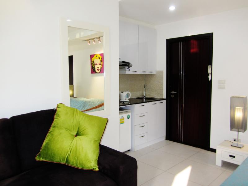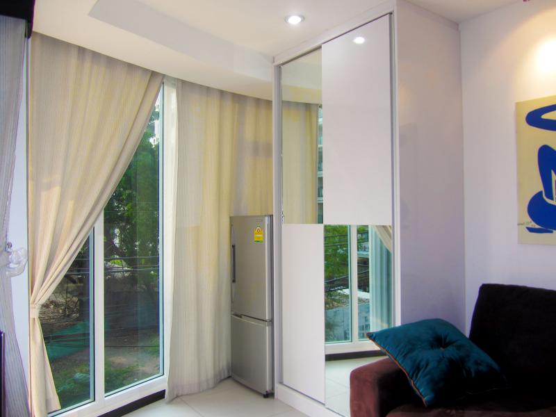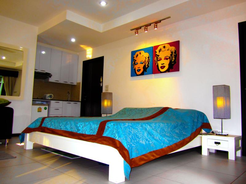 Siam Oriental Twins Condo Pratumnak soi 4, Pattaya, condo 7-story building is divided A - B the room on 5 floor building A Room size 48 SQ.M, 1 Bedroom Type, Fully furnished, European kitchen furniture, large Balcony, City View and Sea, the Pool in the middle of the first floor, sauna, dressing room and entrance by Key card system, Parking under the building, Security 24hr.