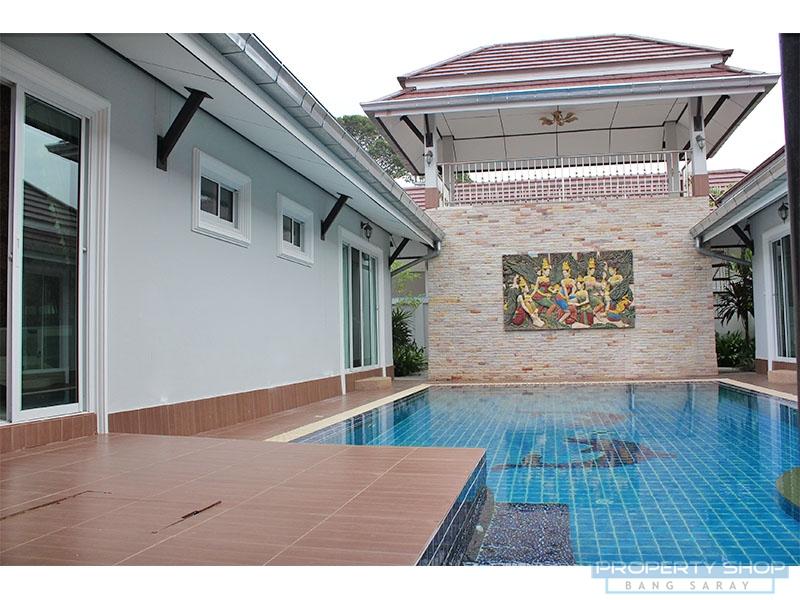 This attractive 4 bedrooms 5 bathrooms and Private swimming pool is located in East Pattaya, on the Bang Saray, which is home to many shops, restaurants (Western & Thai food, markets and easy access to Pattaya). The property is offered for sale in excellent condition and has a bright modern European kitchen.