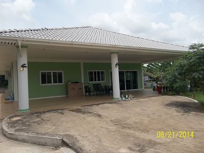 Bungalow in Huai Mek. In the center of town. (Bargain) you have to see. Land size 180 Tarang Wah = 720 square meters. House living spaces about 190 Square Meter living room with 2 air conditioners (70 square meters without pillars), in total there are 5 air conditioners Daikin, 3 bedrooms, main bedroom with walk-in wardrobe, 2 bathrooms, 1 guest WC, large kitchen with bar, 1 inside pantry door integrated into the kitchenette, fully covered terrace with covered parking space 60 sq., 1 outside storage room. Three-phase electric cable current with 30 A and grounded. Many sockets, inside and outside, with lots of light sources, light bulbs! Water storage tank underground with about 7000 liters and pump. Internet Cafe with 20 Computers and Wi-Fi.