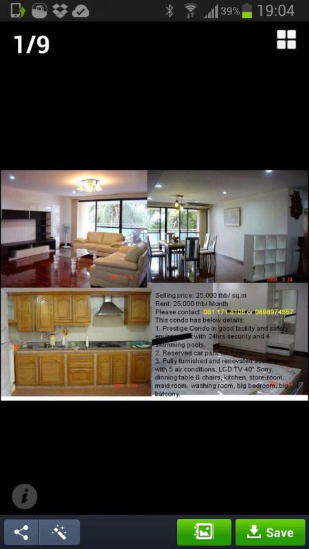 Please contact :- --(Phone number)-- Space :- 227 sq.m., 3rd Floor, PC2 This condo has below details: 1. Prestige Condo in good facility and safety environment with 24hrs security and 4 swimming pools. 2. Reserved car park for 2 cars. 3. Renovated as a new unit ( 3 bed rooms, 4 toilets) accompany with 5 air conditions . 3.1 Living room :- LCD TV 40` Sony, genuine leather sofa set 3.2 Dinning room :- Marble table set, refrigerator & microwave oven etc 3.3 Kitchen room :- Wooden kitchen furniture including washing machine and dish washing machine
