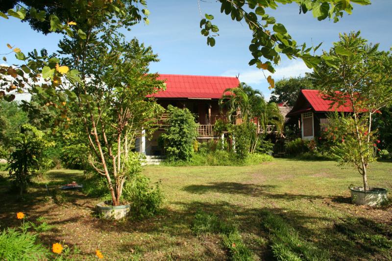 The Rice House is a teak wood barn at least 70 years old, originally built to store rice. We dismantled it in the neighboring village and rebuilt it here. According to local custom, these houses are built on wooden columns to protect the rice from insects and animals.