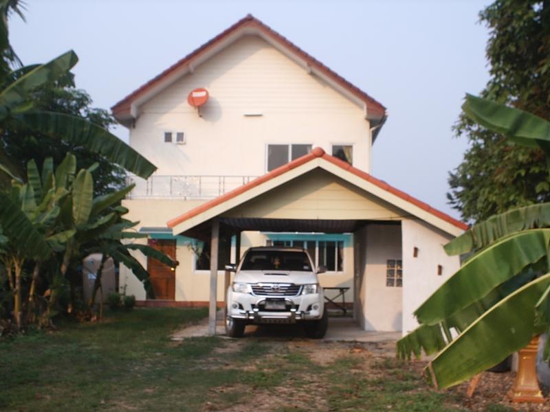 The house is 272 square meters over 2 stories on land total 500 square meters. Externally Car port and bike shed. Banana plants, Papaya plants Mango tree chili plants etc. Quiet road as it runs parallel to the highway 500 meters away. Nearest Airport Udon Thani 200 km about 8 flights a day to Bangkok, mostly dual carriageway very pleasant and easy drive.