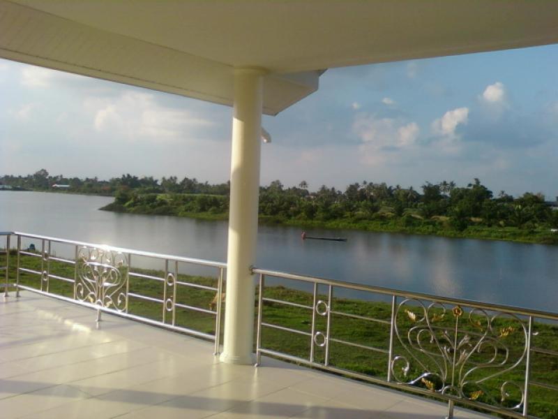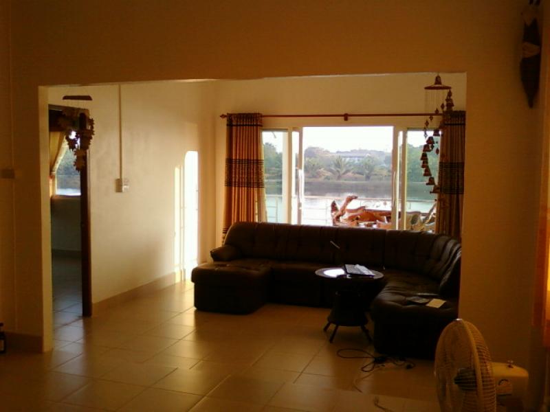 North East Thailand: Two story Brick built house 2012. Overlooking a lake, coconut palms and the mountains of Laos. 500 mtrs from Mekong river and Market. One Km from Town and Hospital.
