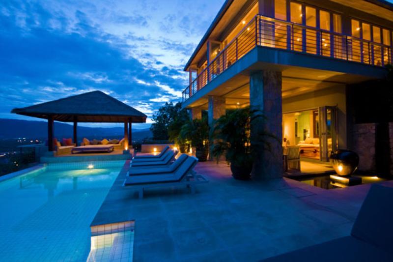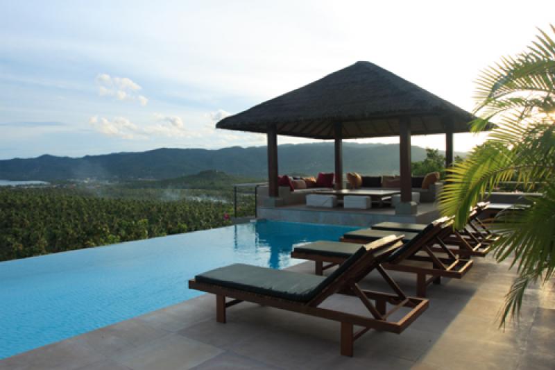 edge swimming pool, dining terrace, poolside lounge and kitchen.