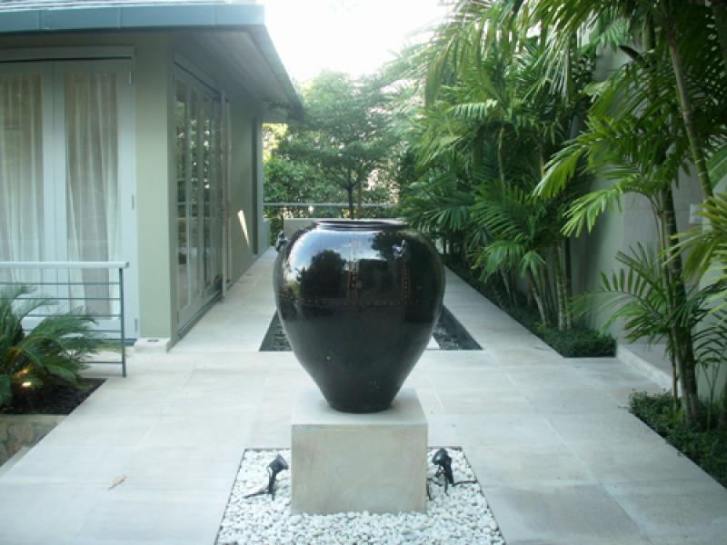 The house is entered down a smooth sandstone staircase leading from the road and car port, past two