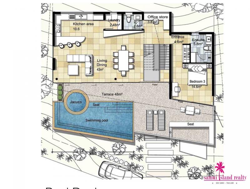 Samui Oasis development – Amethyst 3 bedroom villas are modern, stylish and built to the highest of standards, offering spacious open-plan living spaces with land plots that range from 454 sqm to 566 sqm. The Amethyst villa offers 216sqm of indoor living space and 90sqm of outdoor living space.