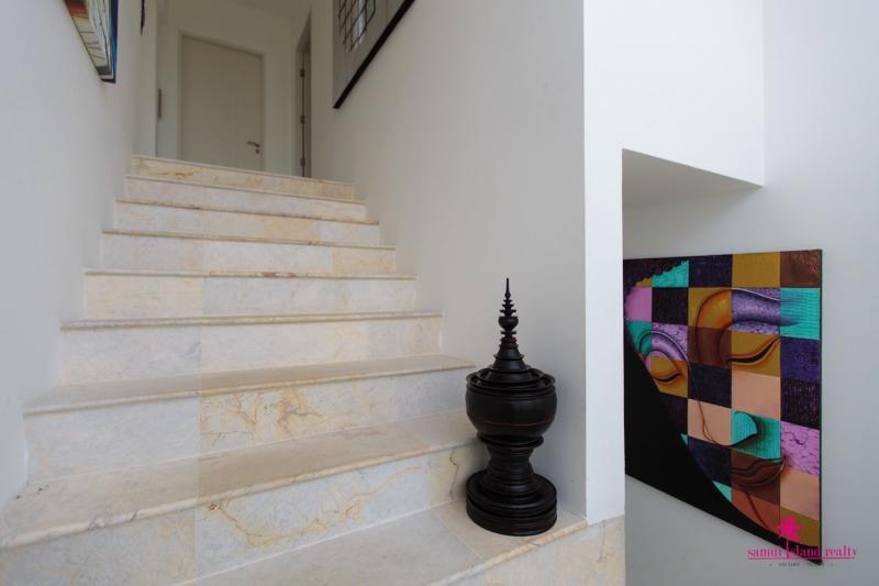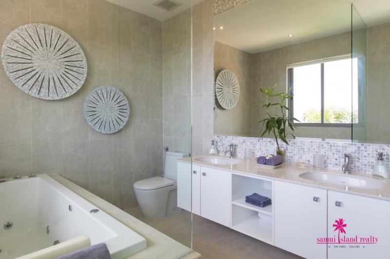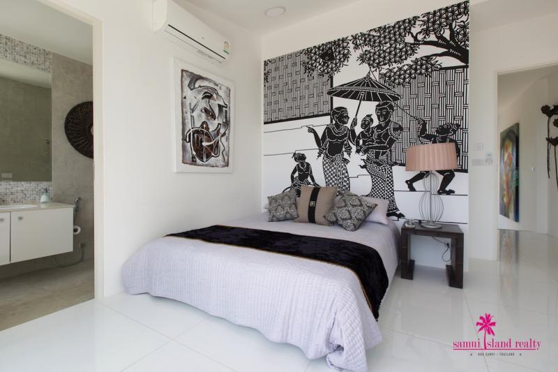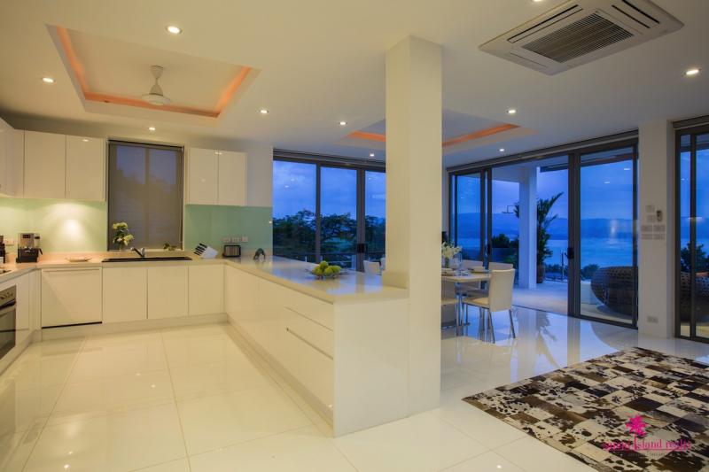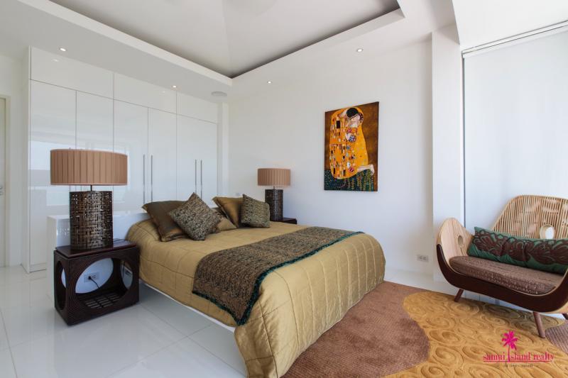 Villa Apsara for sale Koh Samui offers a spacious open plan living area, complete with a modern fully equipped western style kitchen. The main living area is fully furnished to a very high standard, complete with a flat screen TV and sound system & comfortable sofas. The living room includes floor to ceiling glass doors, which open onto the private terrace & infinity edged swimming pool, sun loungers and bar, perfect for entertaining guests.