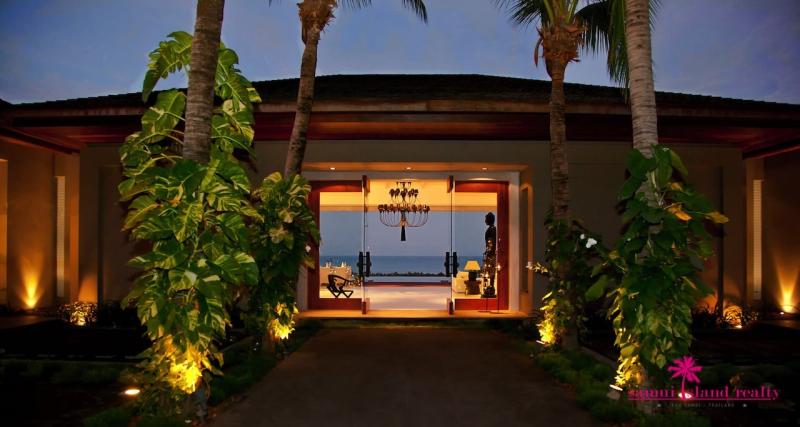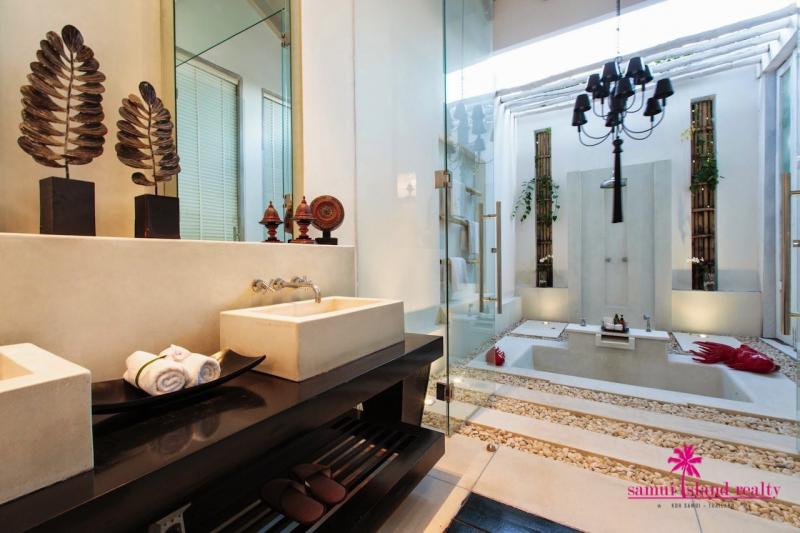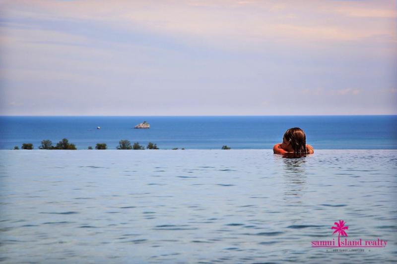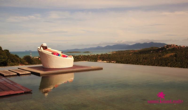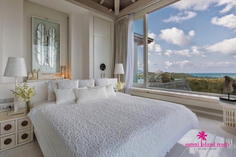Villa Michaela is accessed from the large rear parking bay, from here large wooden door opens into the tropical courtyard with beautiful flowers, trees and fish ponds on both sides. The courtyard pathway leads you to the spacious open-plan living area which boasts the most magnificent panoramic sea views that capture the bays of Plai Laem, Choeng Mon & stretch as to the neighbouring island of Koh Phangan. The main living area offers plenty of living space with comfortable seats and high ceilings that create a greater sense of space. The kitchen is positioned to the rear corner of the living area, cleverly hidden & fully equipped with quality appliances & fitting. Large sliding doors open the living area onto the expansive pool terrace, creating the very best in tropical indoor outdoor living. The terrace boasts an impressive 18 meter infinity edge swimming pool, BBQ zone and alfresco dining table.
