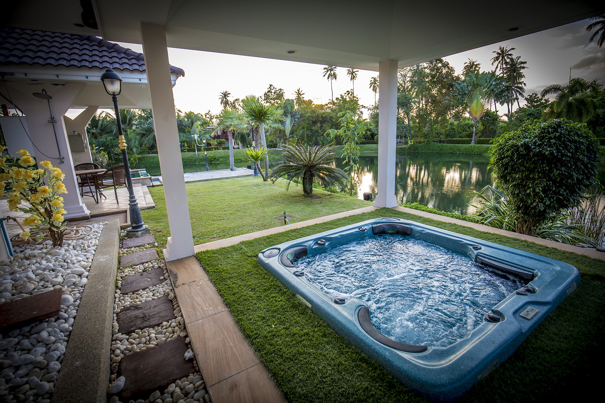 All outside areas including pool and lake are fully lit up at night with romantic lighting if you require.