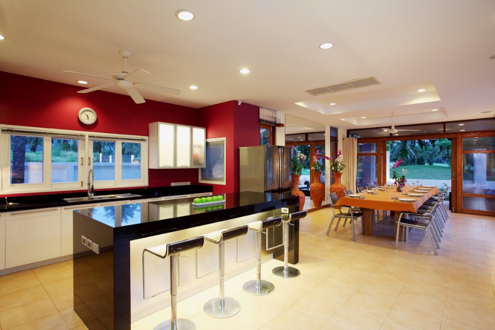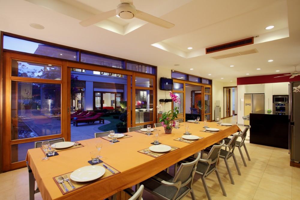 The lower living areas are very light and airy aided by high 3m ceilings and folding and sliding teak wood doors which open onto the main garden areas. The main kitchen and dining room are located adjacent to the swimming pool and all enjoy golf course views.