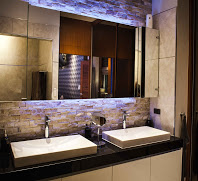 feature and Koi fishes. Wall mounted toilets and led surrounded mirrors. Automatic sprinkler system