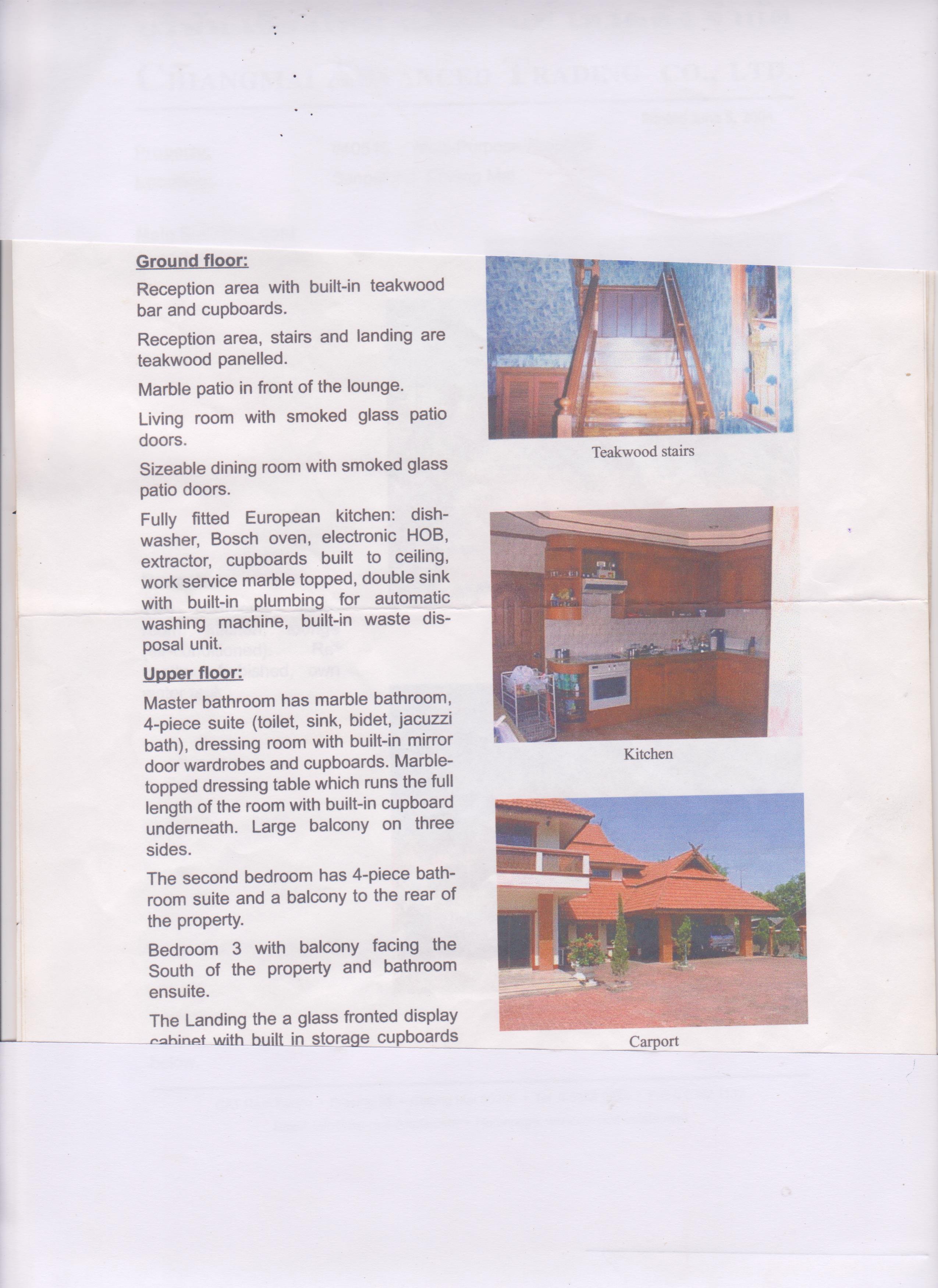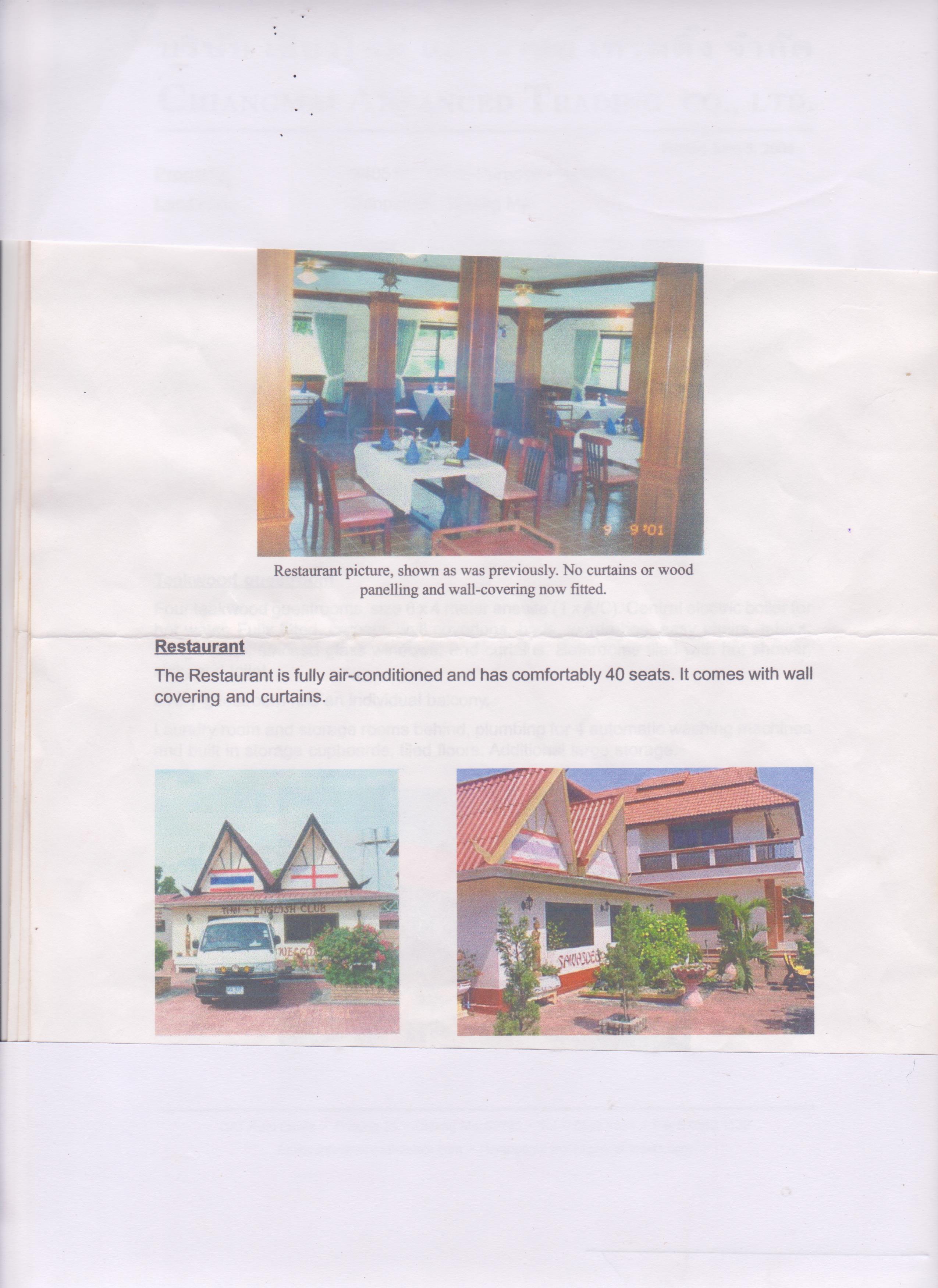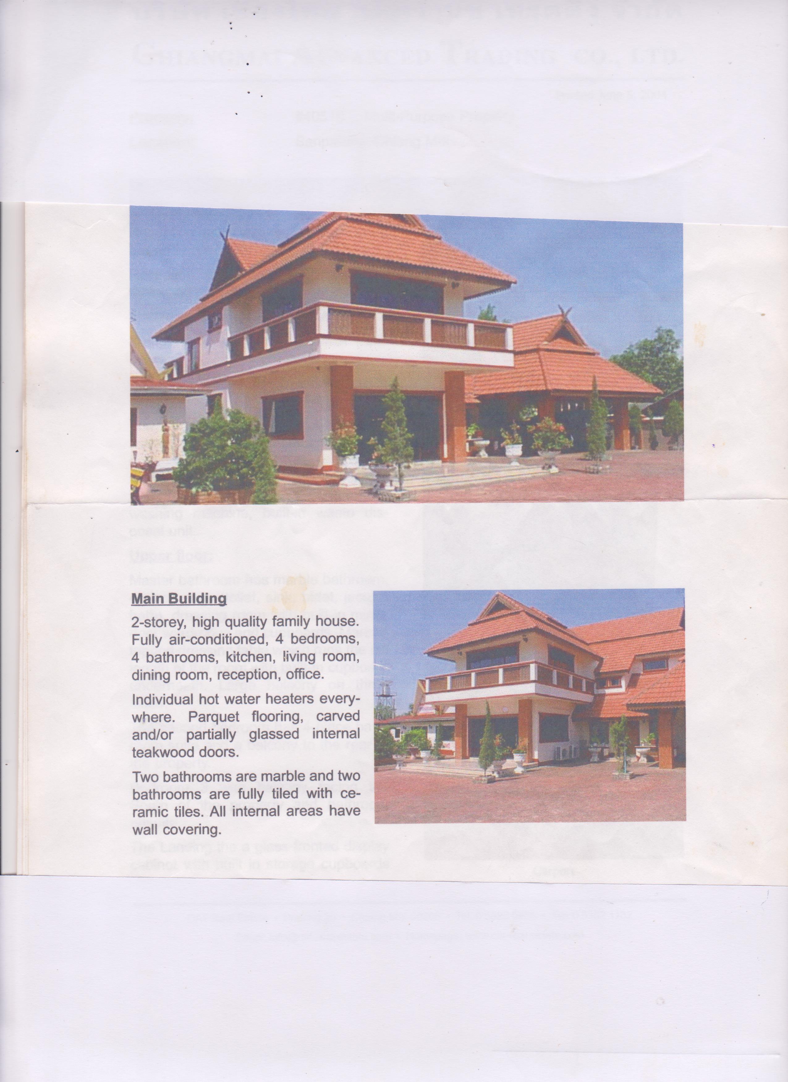 HIGH QUALITY, MULTI_PURPOSE PROPERTY CONSISTING OF: o. Main building, 2 storey, 4 bedrooms, 4 bathroomso. Bar o. Restaurant (40 comfort seats)o. Guestrooms o. 2 bedroom bungalow o. Staff rooms o. Workshop o. 3-phase power supply throughout the property o. The property is fully walled. The property is built in 1997. Size of the land is 2800 square meter. The main house has parquet flooring, fully air-conditioned and has teakwood doors. The bungalow has 2 bedrooms, a bathroom, kitchen, lounge (air conditioned) and has an own water tank and carport. There are 4 teakwood guestrooms. Each 24 square meter. Air-conditioned. There is a central boiler for hot water. Toilets, bathrooms a sink and refrigerators. Each guestroom has his own balcony. There is a laundry room with 4 washing machines. Price is reduced to Thb 12.500.000 (price is negotiable) If you are interested, or you want more information, please call Mr F.Bos tel. -(Phone number)- (English, Dutch and German speaking) or mail Or Mrs J.Jintan (Thai speaking) tel: --(Phone number)-- or mail The property is located near highway 108, ca 40 km south-west from Chiang Mai.